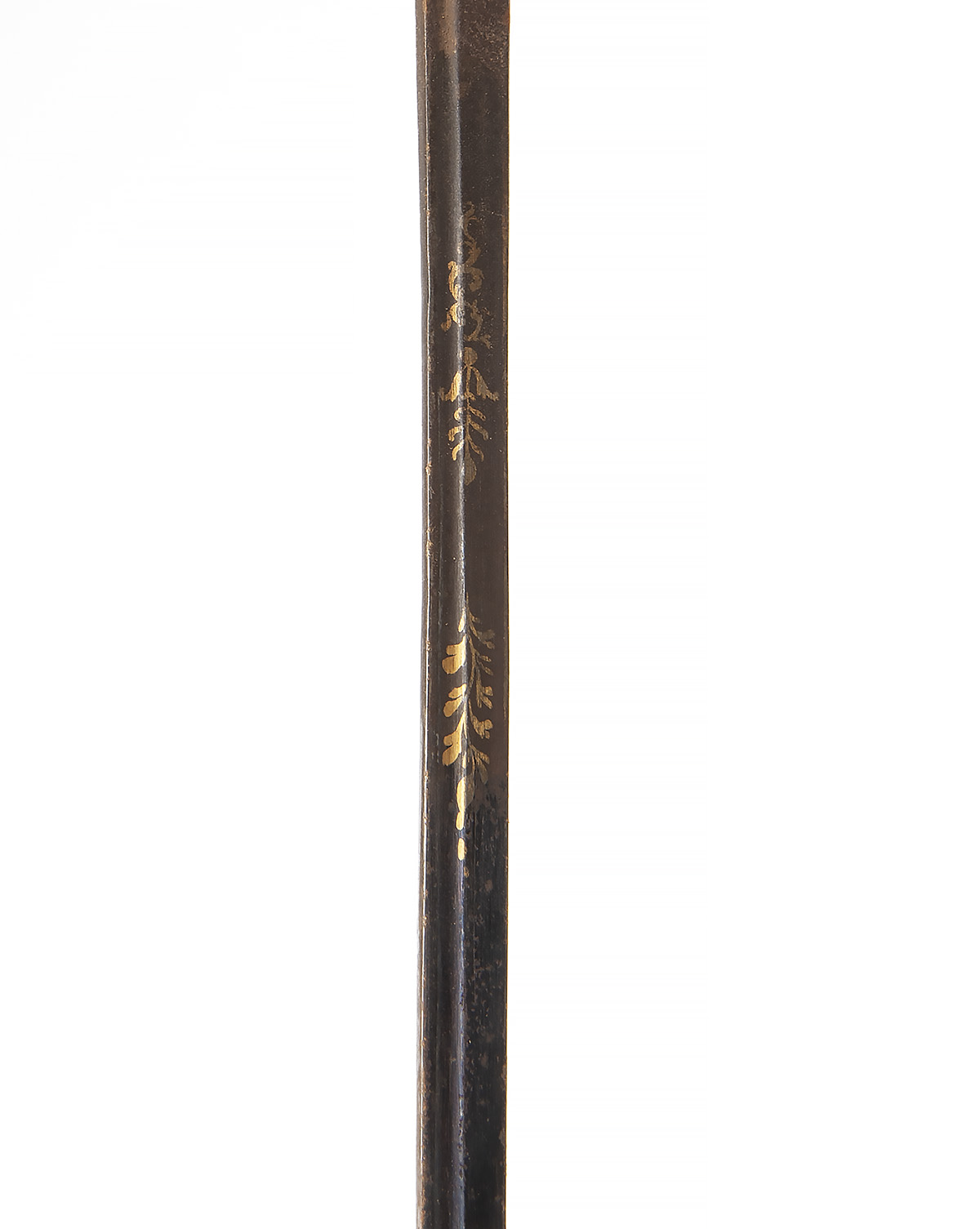 circa 1810, with single edged 26 1/2in. blade with narrow fuller along the back edge to within 7in. of the tip, the first 10 3/4in. decorated with gilt foliage on a blue ground (some discolouration), naturalistic wood shaft with copper collar at neck (age cracks and small losses) and crooked handle bored through with escutcheoned lanyard aperture, 37 1/2in. overall including copper ferrule at tip