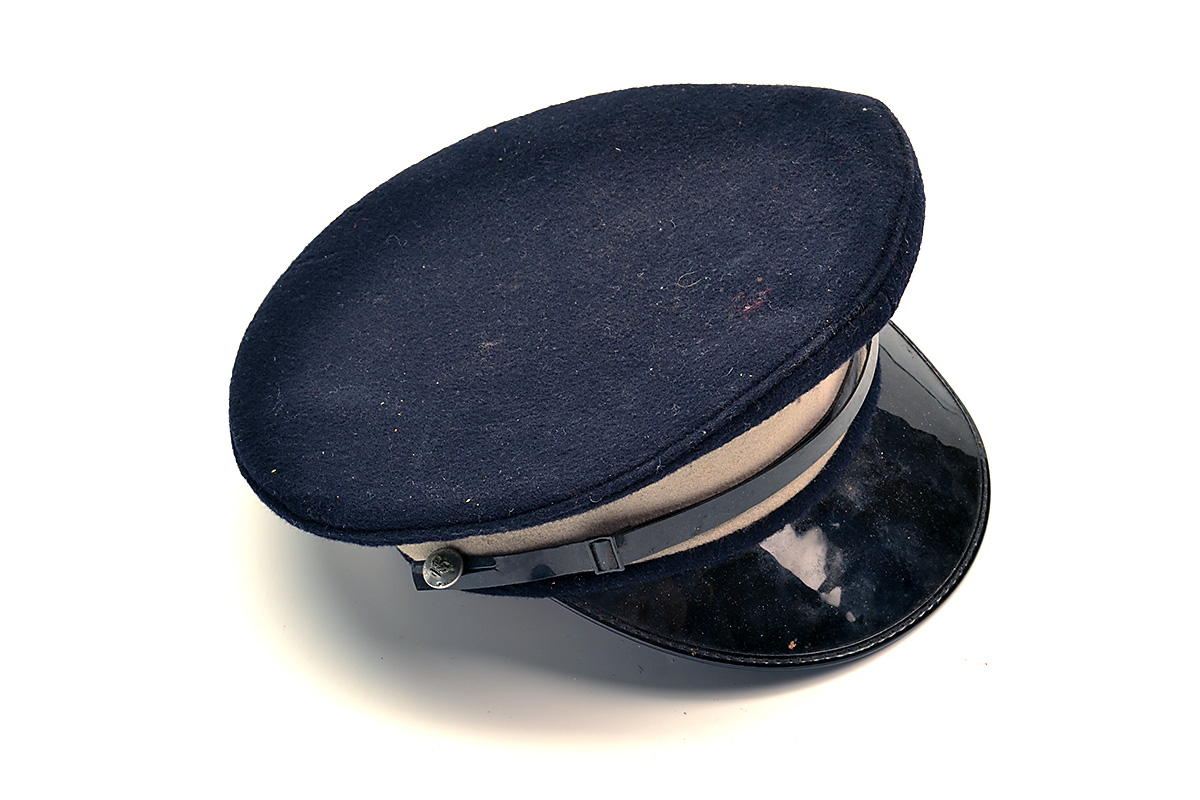 THREE ITEMS OF HEAD-GEAR including a British peaked cap in black with white banding, a tropical sun helmet and a Chelsea Pensioners hat marked 'R.H.', the last with some moth (3)