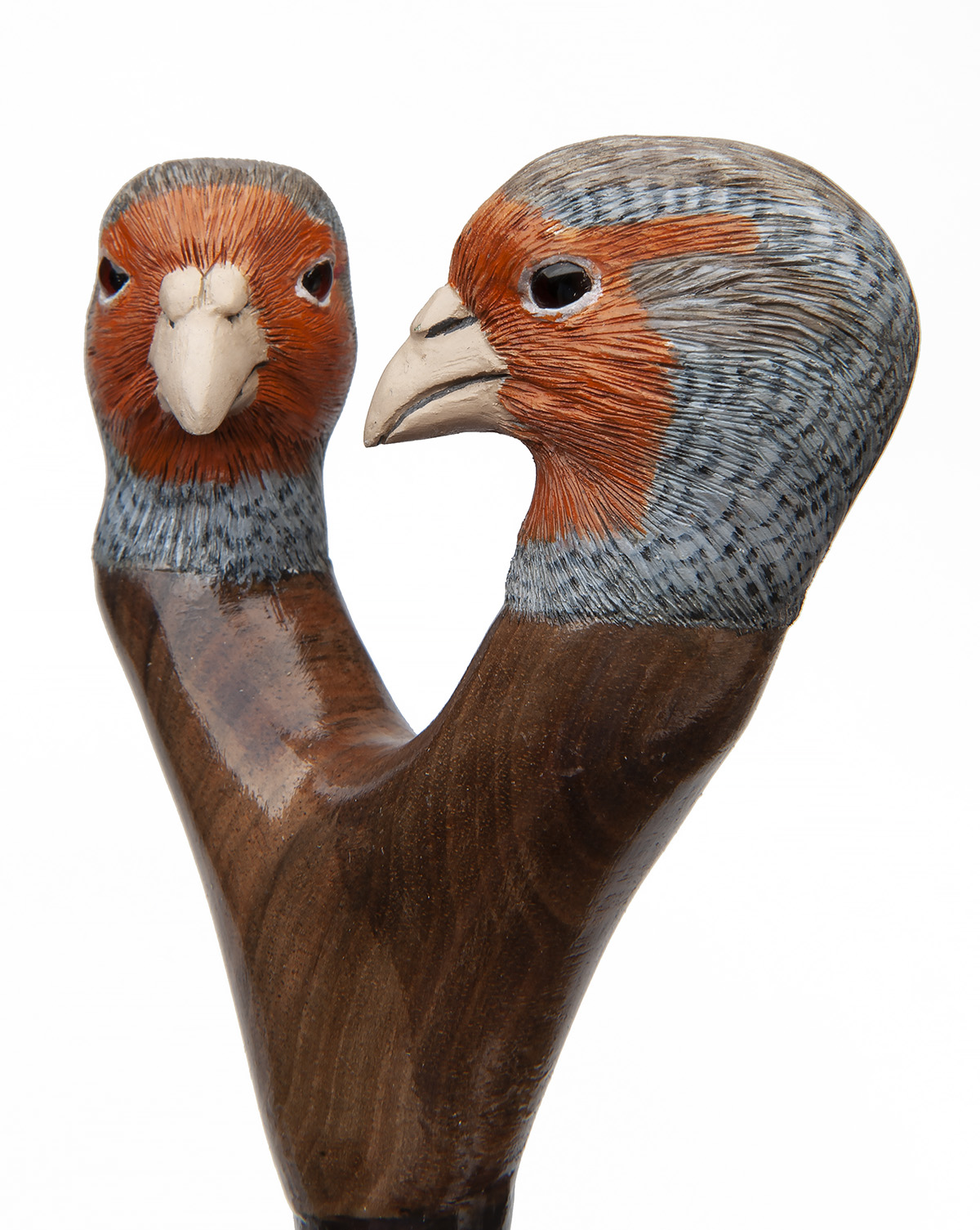 measuring approx. 59in. in length with hardwood shaft, brass ferrule, the handle carved and painted in the form of the two partridge heads