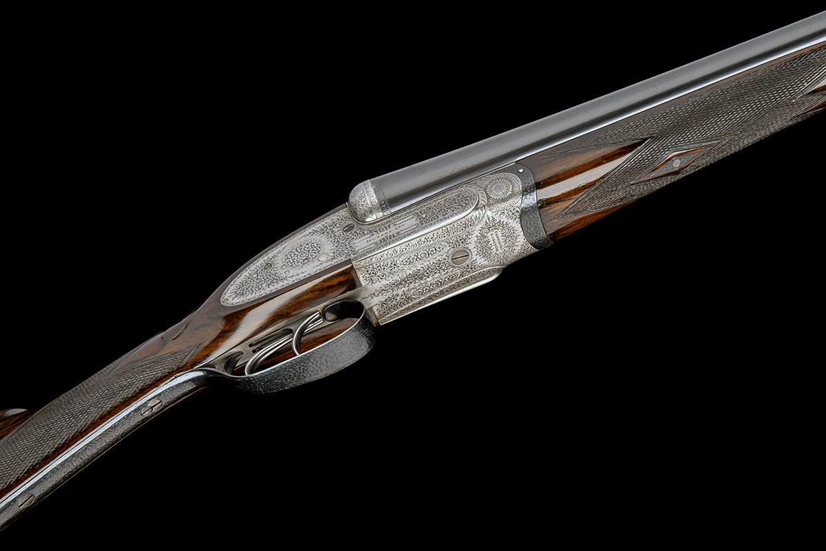 28in. replacement nitro barrels (circa 1973), the rib engraved 'H.J. HUSSEY LTD. 81 NEW BOND ST. LONDON.', 2 1/2in. chambers, bored approx. 1/4 and 1/2 choke, toplever gold-inlaid '1', automatic safety with gold-inlaid 'SAFE' detail, gas checks, gold-inlaid cocking-indicators, best bold acanthus scroll engraving with floral bouquets, the underside with 'IMPERIAL EJECTOR', brushed bright and reblued finish overall, 14 1/4in. (likely replacement) stock, weight 6lb. 13oz.