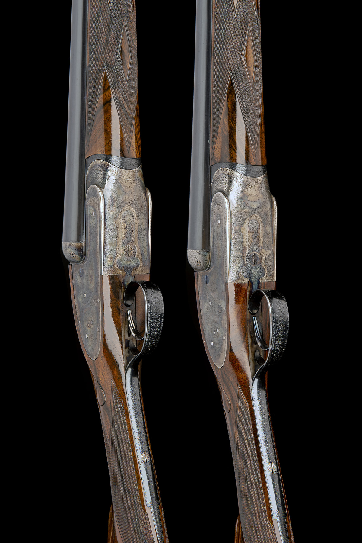 29in. nitro chopperlump barrels, ribs engraved 'J. PURDEY & SONS. AUDLEY HOUSE, SOUTH AUDLEY STREET, LONDON. MADE OF SIR JOSEPH WHITWORTH'S FLUID PRESSED STEEL', (faint) and gold-inlaid '1' and '2' at the breech ends, 2 1/2in. chambers, bored approx. 1/4 and 3/4 choke, left walls at 18, toplevers gold-inlaid '1' and '2', automatic safeties with gold-inlaid 'SAFE' details, (No.2 requires attention, will fire right barrel in the on position), removable striker discs, arrow cocking-indicators, Boss 1905 improved patent single-triggers, (No.1 requires attention, not firing on left barrel), rolled-edge triggerguards, best fine acanthus scroll engraving with floral bouquets, the triggerplates with Boss single trigger patent details, retaining much renewed colour-hardening and finish, 15 5/8in. highly-figured replacement stocks, No. 2 cracked and repaired at hand and right underhorn, weight 6lb. 14oz., in their brass-cornered oak and leather case with some accessories