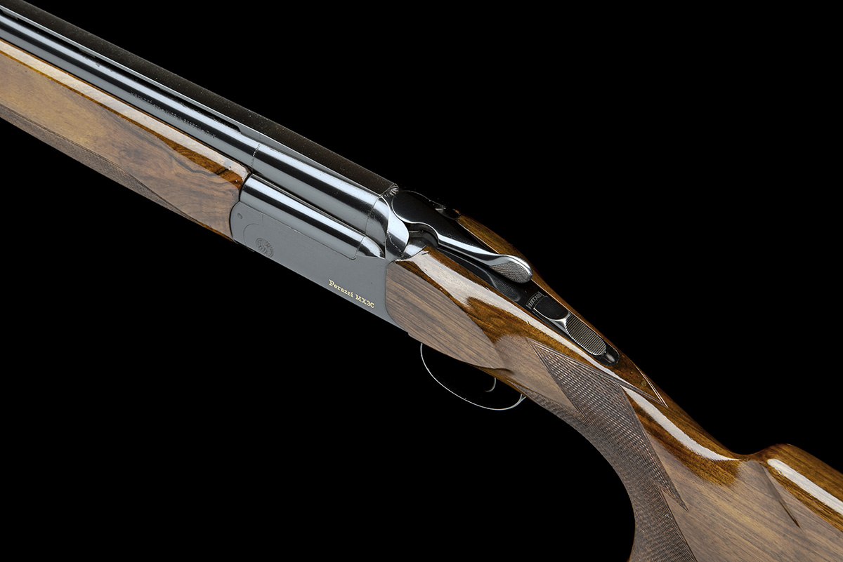 29 1/2in. nitro barrels with no mid-rib and 10mm ventilated matt top-rib, 2 3/4in. chambers, multichokes (with spares), manual safety with integral triggerplate release catch, the makers name and model designation gold-inlaid on the left side, blacked finish, 14 1/4in. pistolgrip stock including 3/4in. rubber recoil pad (cracked at hand) weight 8lb. 8oz., in its makers universal case
