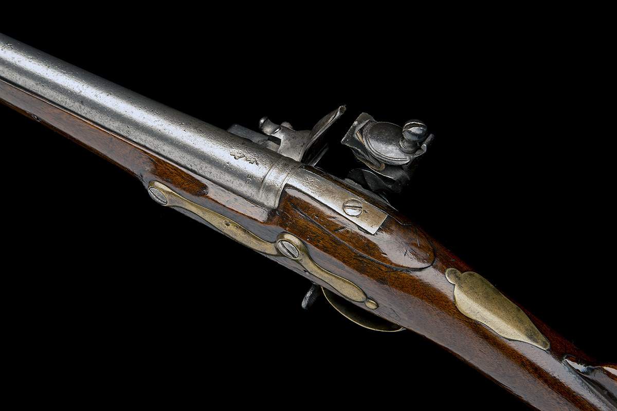 First Pattern circa 1765 and probably manufactured in the Tower Armouries, London, with 37in. round iron barrel with 'King's' proof and makers mark for Richard Edge, block fore-sight, moulded band at breech, solid top-tang, rounded borderline engraved lock (signature and crown device erased), walnut handrail three-quarter stock, brass furniture and replacement wood ramrod