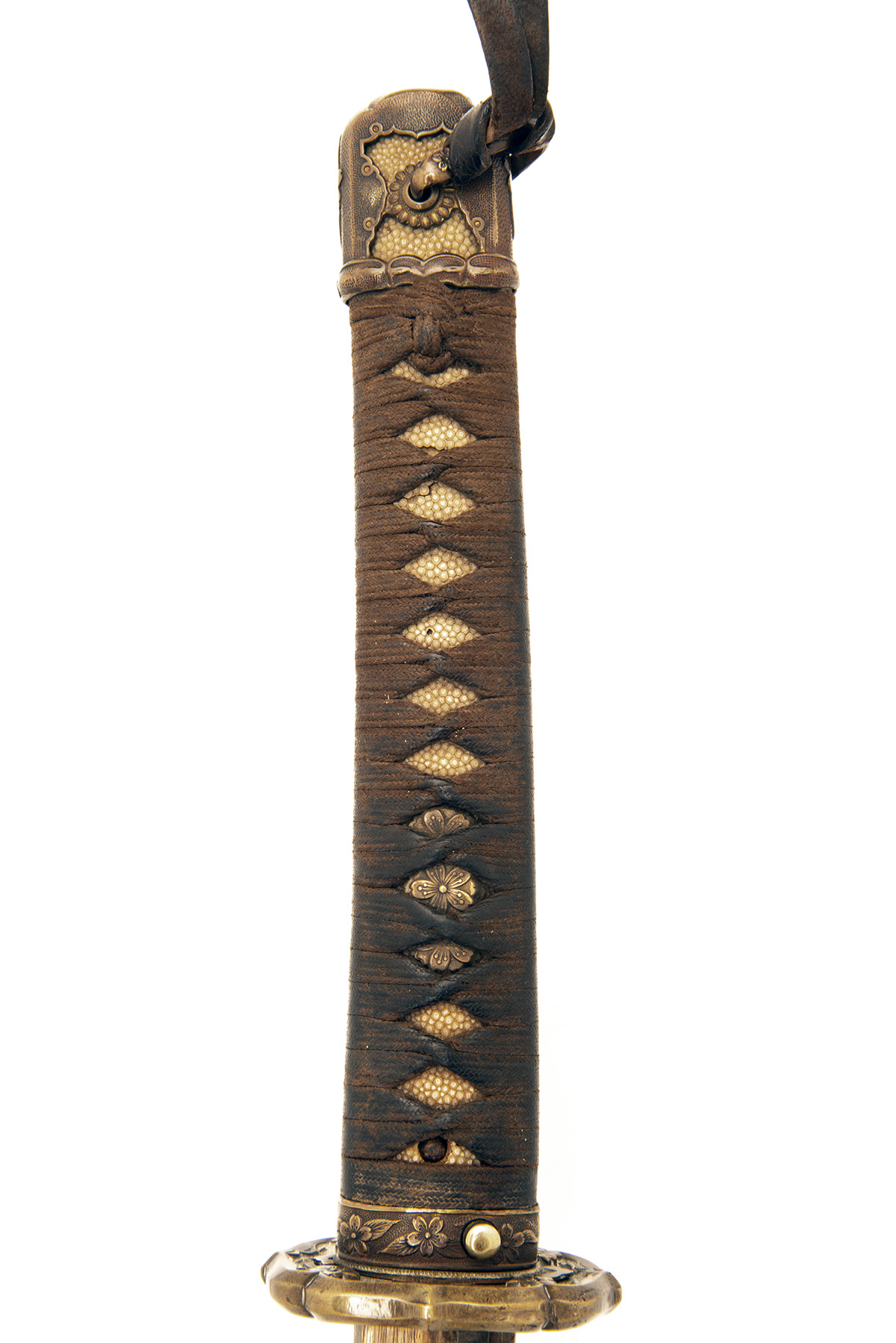 with signed smith-made arsenal 25in. blade (some staining and speckling), straight visible 'hamon', copper 'habaki', solid carved brass military 'tsuba' and mounts with scabbard lock, cotton bound rayskin hilt, complete with its leather covered metal service scabbard and leather sword-knot