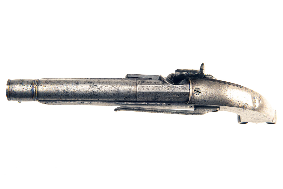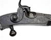 circa 1880, with triple-staged 6in. barrel engraved with scrolls and trophies (cleaned), borderline and scroll engraved lock signed 'MURDOCH', engraved hammer, distinctive Scottish style all steel stock with slab-sided butt (traces of engraving), iron belt-hook, 'ramshorn' heel with 'thistle-head' pricker stored between the horns, unguarded ball trigger and under-barrel iron ramrod