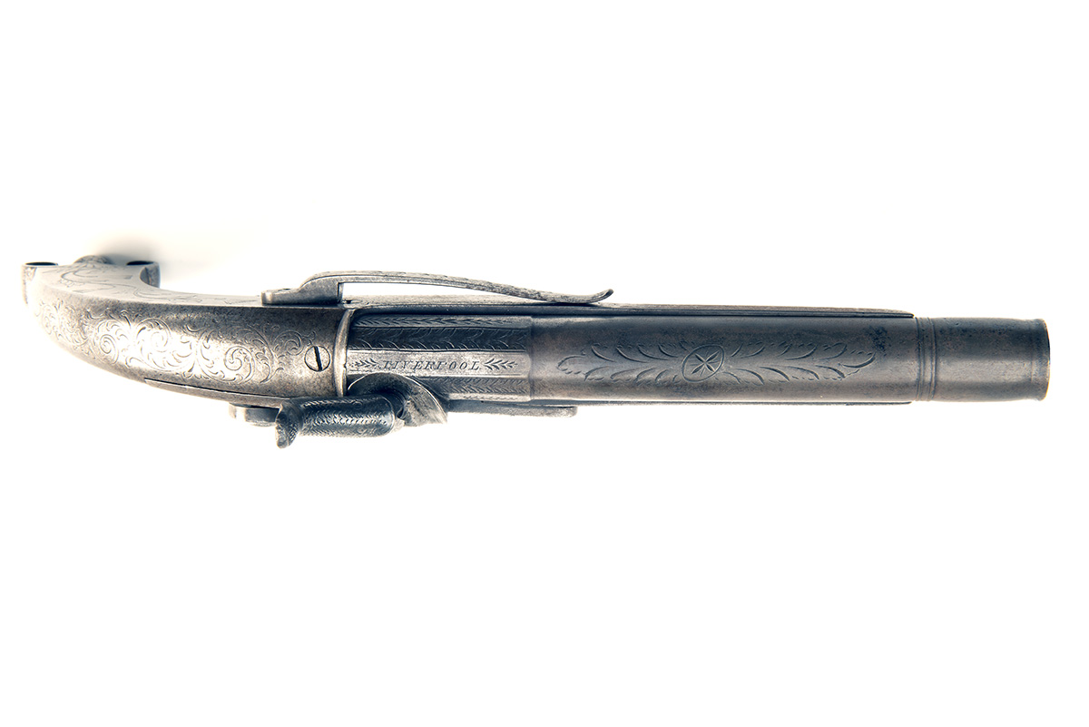circa 1880, with triple-staged 6in. barrel engraved with scrolls and foliage, the top at breech signed 'LIVERPOOL', borderline and scroll engraved lock signed 'KIND', engraved slab-sided hammer, distinctive Scottish style all steel stock with slab-sided butt engraved with stylised thistles, 'ramshorn' heel with ball-headed pricker stored between the horns, the fore-end engraved with foliage, unguarded ball trigger, belt hook on the left hand side and under-barrel iron ramrod