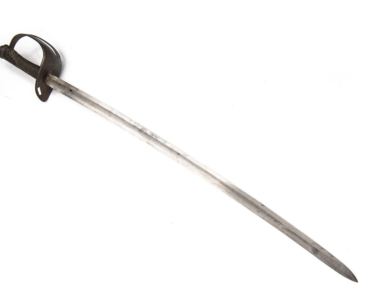 A CONTINENTAL SABRE, with slightly curved broad fullered 35in. blade marked 'S&K', iron half-basket with twin ribbon bars, wire-bound hily and capped pommel, complete with its iron scabbard