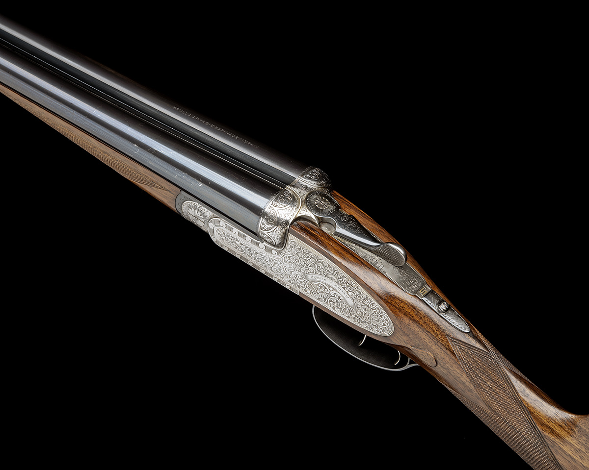28in. nitro chopperlump barrels, 2 3/4in. chambers, bored approx. true cyl. and 1/4 choke, engraved arcaded fences, removable striker discs, automatic safety, cocking-indicators, triggers set for the left hand, articulated front trigger, bold acanthus scroll engraving, bright finish, 15 1/4in. stock (cast on for the left shoulder) including buttplate, weight 7lb. 3oz.