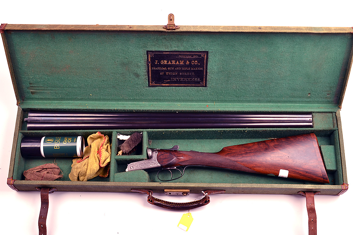 J. GRAHAM & CO. 12-BORE BOXLOCK EJECTOR, serial no. 2336, 28in. nitro reproved barrels, the rib engraved 'J. GRAHAM & CO. INVERNESS. SIR JOSEPH WHITWORTH'S COMPRESSED FLUID STEEL.' and '1', and with acanthus scroll detailing at the breech-end, 2 1/2in. chambers, bored approx. true cyl. and 1/4 choke, scoop-backed treble-grip action, toplever engraved '1', automatic safety with gold-inlaid 'SAFE' detail, intercepting sears, border and acanthus scroll engraving surrounding the makers name in a scrolling banner, bright and reblued finish overall, 14 1/2in. figured stock including 3/8in. wooden extension, (split at head on the right-hand side, and small insert repair at head on the left-hand side, weight 6lb. 6oz. in its canvas case with some accessories