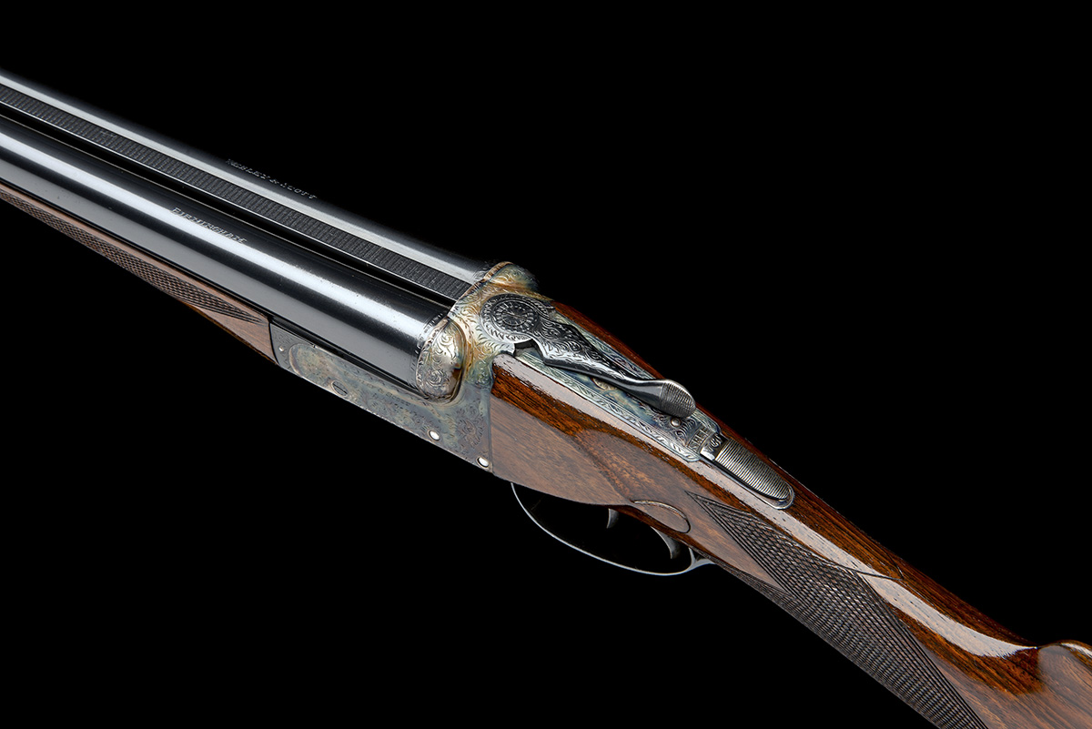 26in. nitro barrels with raised file-cut matt rib, the tubes engraved 'WEBLEY & SCOTT. BIRMINGHAM.', 2 3/4in. chambers, bored approx. imp. cyl. and 1/4 choke, automatic safety with engraved 'SAFE' detail, border and acanthus scroll engraving, retaining much original colour-hardening and finish, 14 3/4in. figured stock with drop-points, weight 5lb. 15oz.