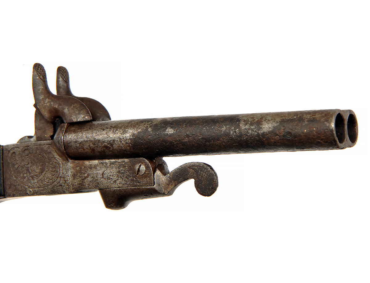 A 12mm PINFIRE DOUBLE-BARRELLED PISTOL, UNSIGNED, no visible serial number,