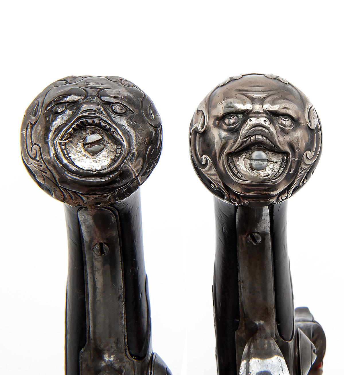 circa 1760 and possibly signed for 'JOHNSON, LONDON', with 5 1/4in. turn off cannon barrels, traces of scroll engraving and London proofs at breech, borderline engraved radiused action bodies with applied top-tangs with feathered terminals, traces of engraving and moulding to the frizzen fronts, borderline engraved circular top-jaws, walnut grips swelling at the pommel and mounted with white-metal grotesque mask butt-caps (one dented), carved aprons around the top-tang, complex white metal escutcheons engraved with a wreathed arm holding a sword vertically aloft surrounded by the motto 'NE PARCAS NEC SPERNUS' (have no mercy and scorn), moulded trigger-guard bows, pierced white-metal side-plates and iron belt-hooks