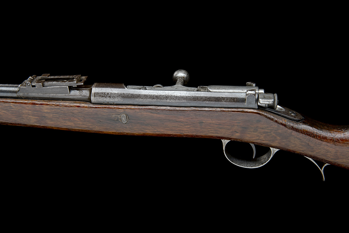 STEYR, AUSTRIA 8mm x 60R (KROPATSCHEK) BOLT-ACTION REPEATING SERVICE RIFLE, MODEL '1886', serial no. O922, circa 1886, with 32 1/2in. sighted smooth-bored barrel, rounded receiver with straight bolt handle, the action body stamped 'OE.F.G. STEYR 1886', a ribboned crown over 'L.I.' and 'M1886', walnut three-quarter stock (some re-profiling at wrist) with iron furniture including full-length magazine tube and complete with cleaning rod mounted in channel on the left hand side of fore-end