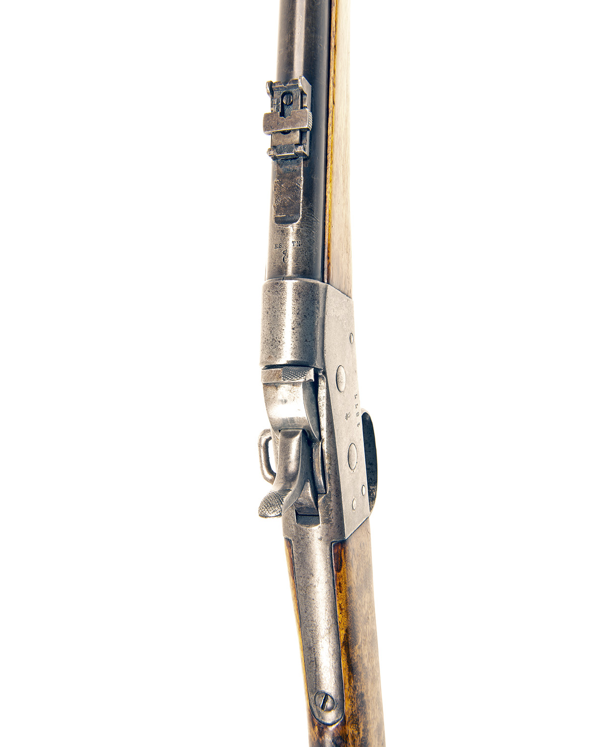 manufactured under licence from Remington by Carl Gustav and dated for 1877, with blued 18in. barrel, iron nose-cap with integral fore-sight, small elevating ladder rear-sight, slab sided dated and numbered receiver with rolling breech and central hammer, pale walnut butt-stock (armourer's patched repair to left hand side), iron heel-plate, mount for saddle ring (ring absent) and full-length pale walnut fore-end, traces of finish throughout