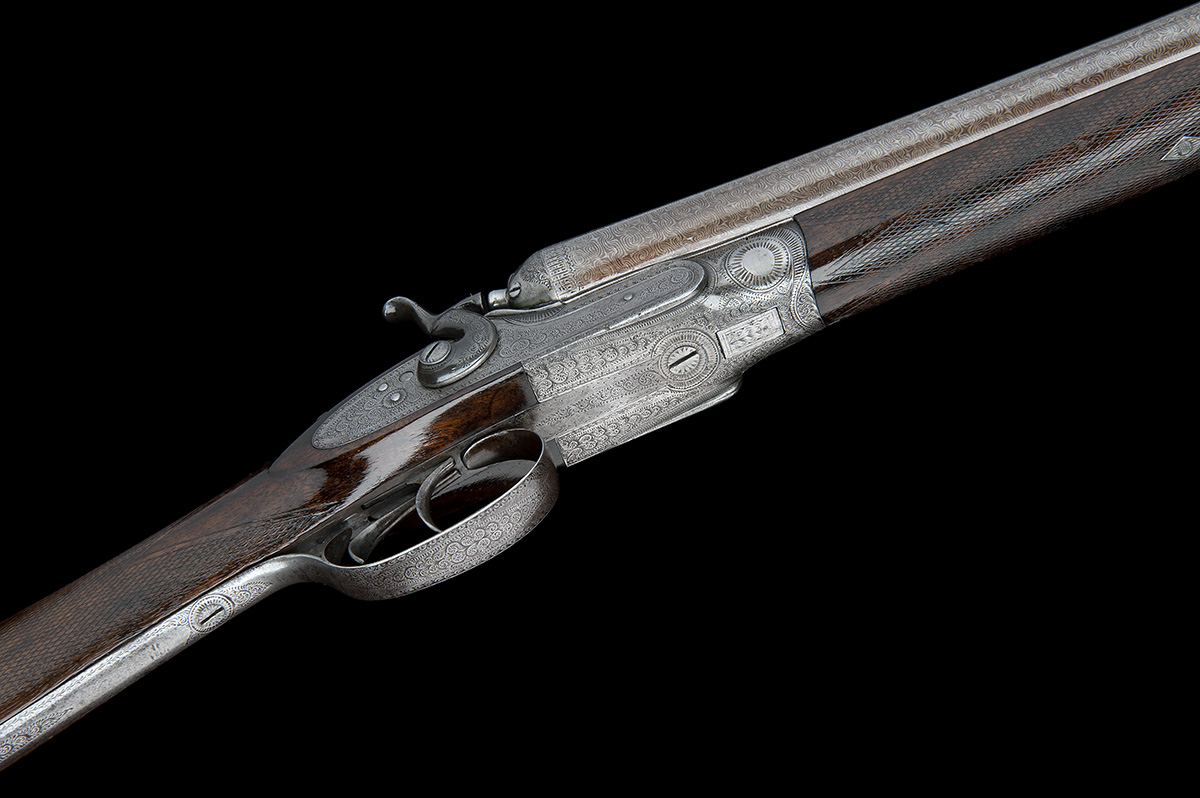 30in. nitro reproved damascus barrels, 2 1/2in. chambers, bored approx. true cyl. and 3/4 choke, treble-grip action with carved percussion fences, rebounding locks, border and acanthus scroll engraving, 14 1/4in. stock including buttplate, weight 6lb. 8oz.