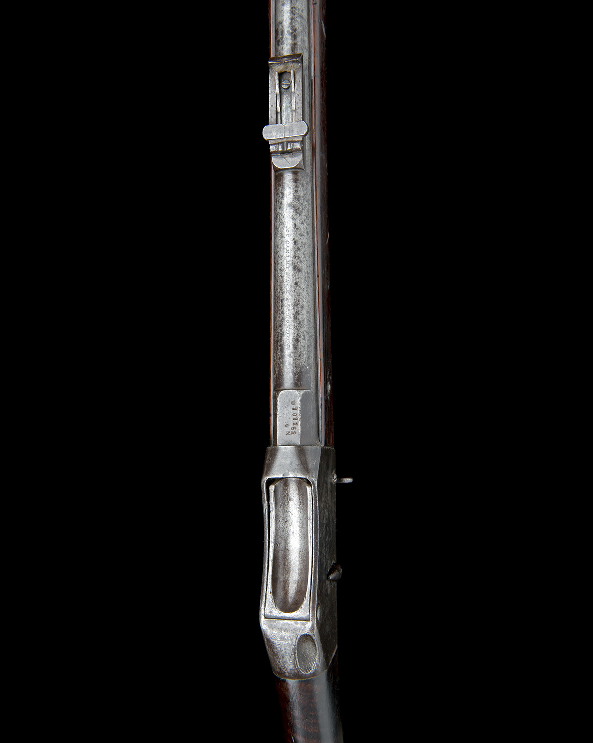 circa 1890, with 33 1/4in. barrel, block and blade fore-sight, elevating ladder rear-sight, the top of barrel signed 'McCARTHY RUCK & Co. LONDON', commercial proofs, plain slab-sided receiver with tear-drop cocking indicator and chequered thumb depression, walnut butt-stock, iron furniture including short under-lever and two barrel-bands and provision for clearing-rod (missing)