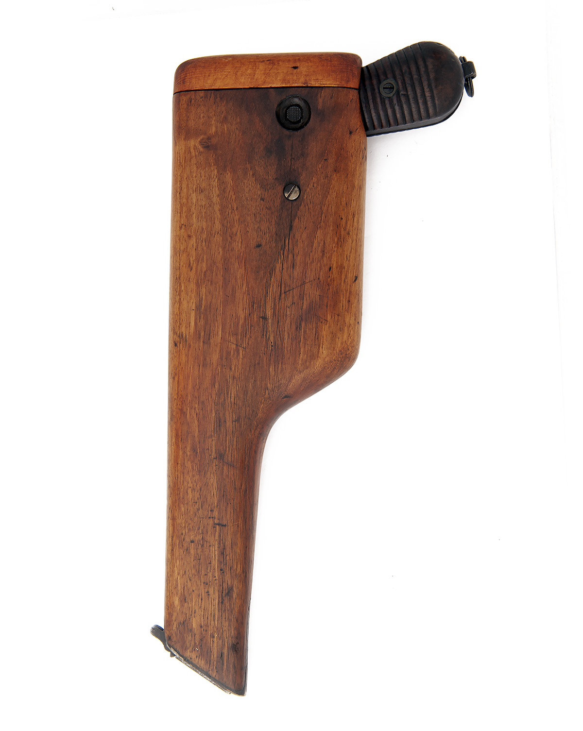 for between 1932-34, with blued 5 1/2in. barrel stepped forwards of the chamber, pinched blade fore-sight, elevating 1000 metre rear-sight, short extractor, new style safe and hammer, milled frame marked 'NOT ENGLISH MAKE', 12-groove ribbed walnut bag-shaped grips, lanyard ring at heel and internal ten-shot magazine, complete with its wooden holster-stock (number obscured, glued repairs and replacement lid)