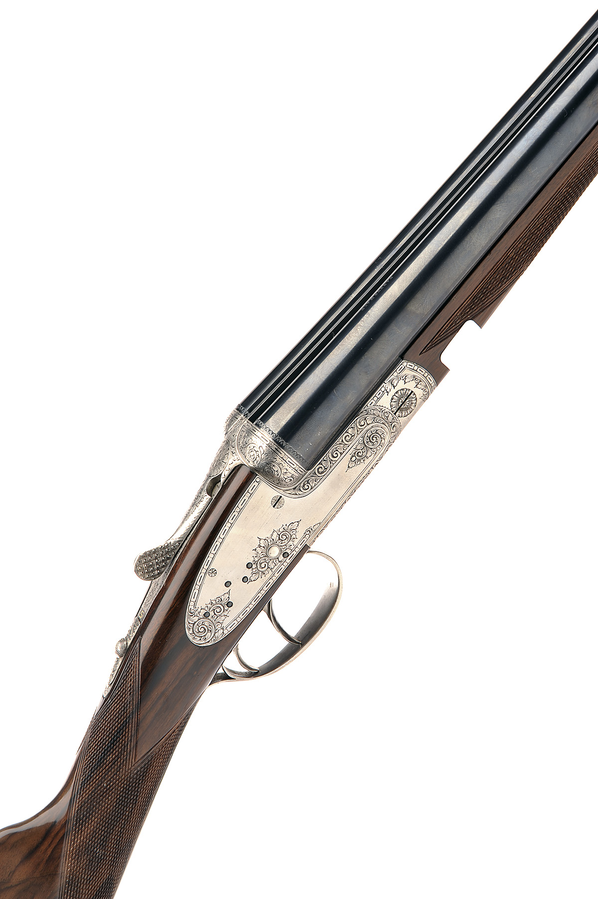 IGNACIO UGARTECHEA FOR PARKER HALE 12-BORE SIDELOCK EJECTOR, serial no. 160339, 27 1/2in. nitro chopperlump barrels, right tube engraved 'PARKER HALE', 2 3/4in. chambers, bored approx. imp. cyl. and 1/4 choke, treble-grip action with hidden third bite, removable striker discs, automatic safety, articulated front trigger, rolled-edge triggerguard, bold acanthus scroll engraving, bright finish overall, 14 3/4in. stock, weight 7lb. 1oz.