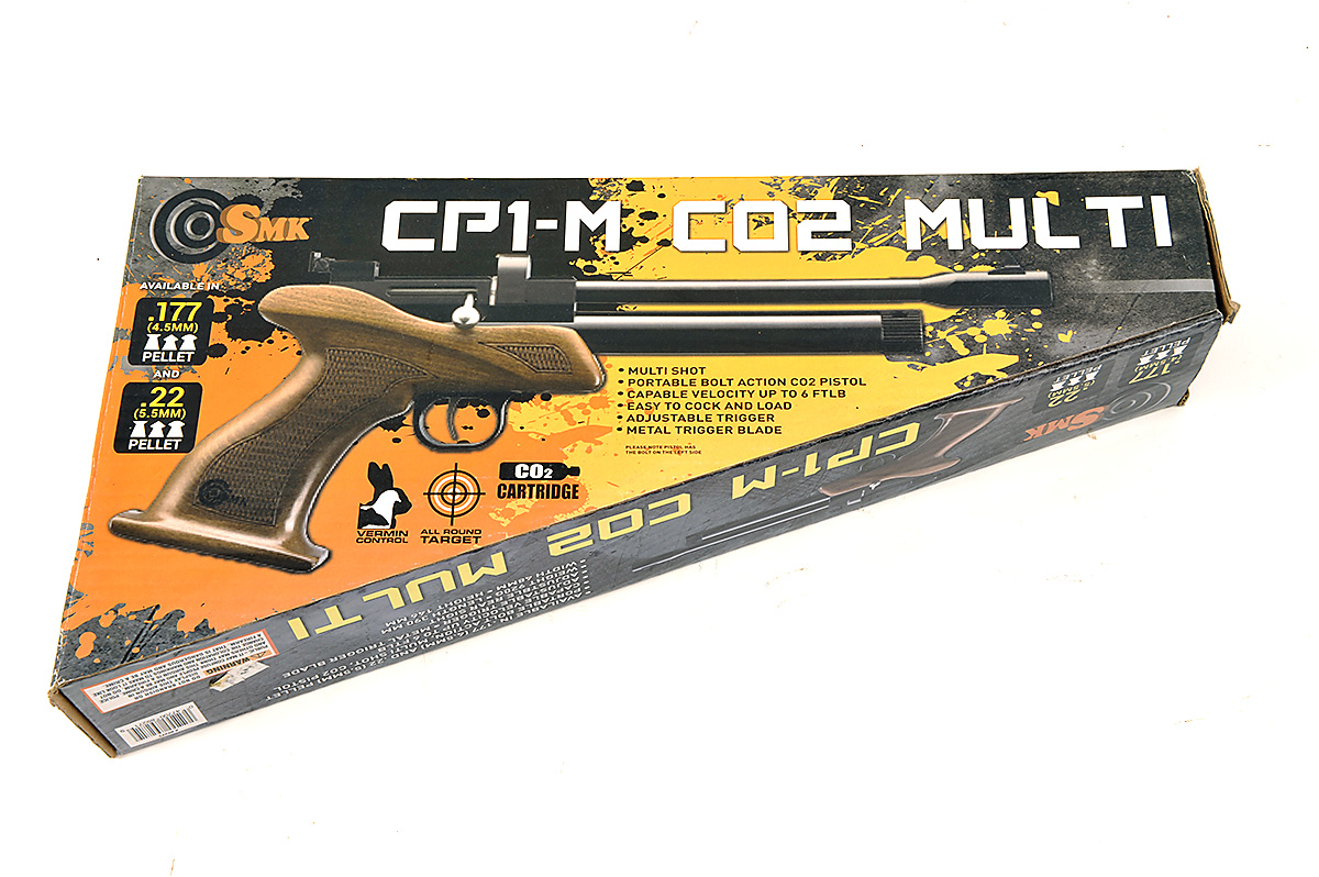 A BOXED NEW AND UNUSED .177 CO2-POWERED REPEATING AIR-PISTOL SIGNED SMK, MODEL 'CP1-M', no visible serial number, with blued floating 9in. barrel, adjustable sights, bolt-action receiver, under-barrel reservoir and chequered wood grip, in its makers polystyrene and card carton with magazine and instructions