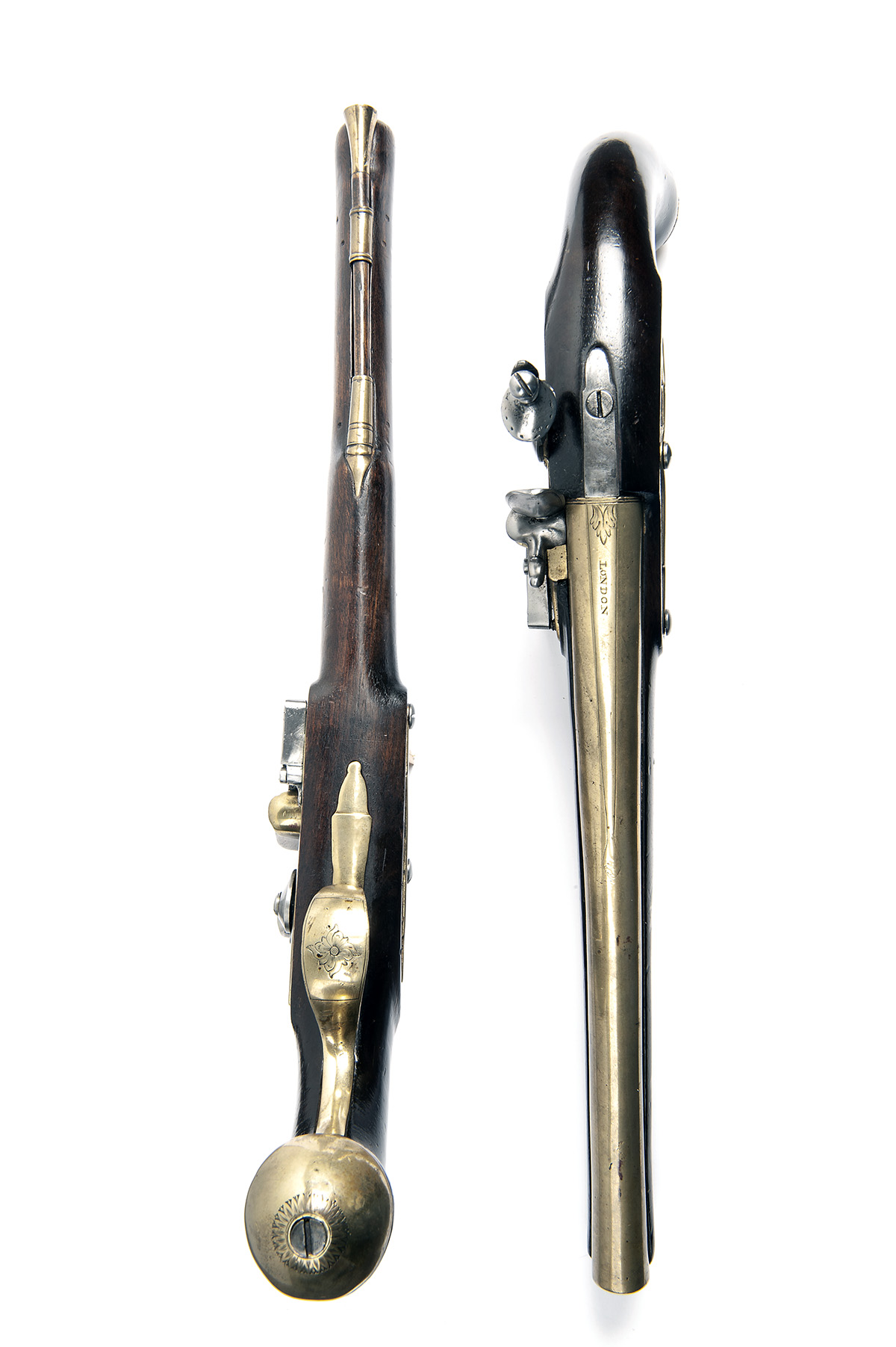 R. WHEELER, LONDON AN IMPRESSIVE EARLY PAIR OF 20-BORE FLINTLOCK BRASS-BARRELLED HORSE-PISTOLS, no visible serial numbers,