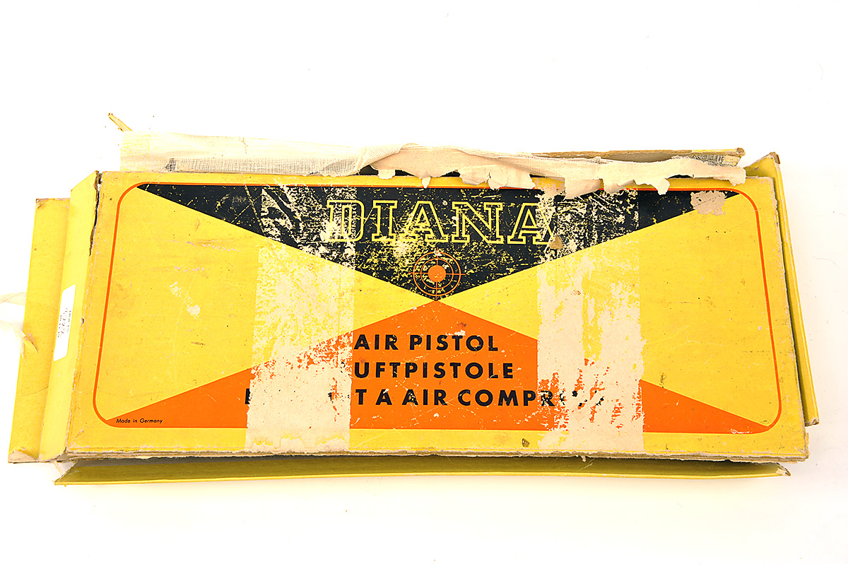 ** A BOXED .177 BREAK-BARREL AIR-PISTOL SIGNED DIANA, MODEL '5', no visible serial number, early post war type with blued 7in. barrel, tunnel fore-sight, adjustable rear-sight, Lucerne retailers decal to air-chamber and varnished wood receiver with integral grip, generally collectors condition in its maker's card carton (torn and distressed)