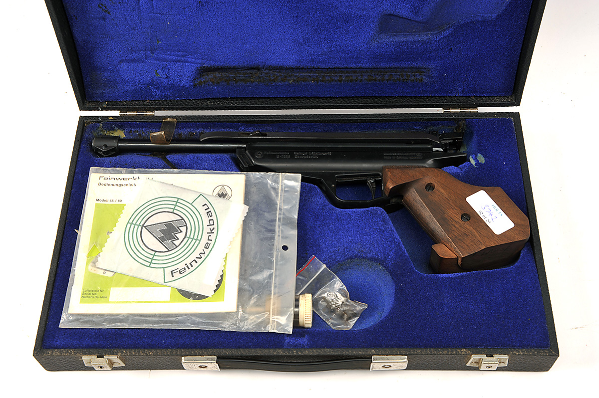 ** A CASED .177 SIDE-LEVER RECOILLESS MATCH AIR-PISTOL SIGNED FEINWERKBAU, MODEL '80', serial no. 204575. with exposed 7 1/8in. sighted barrel, sliding breech, alloy receiver and anatomical walnut right hand grip, in its maker's case with some accessories