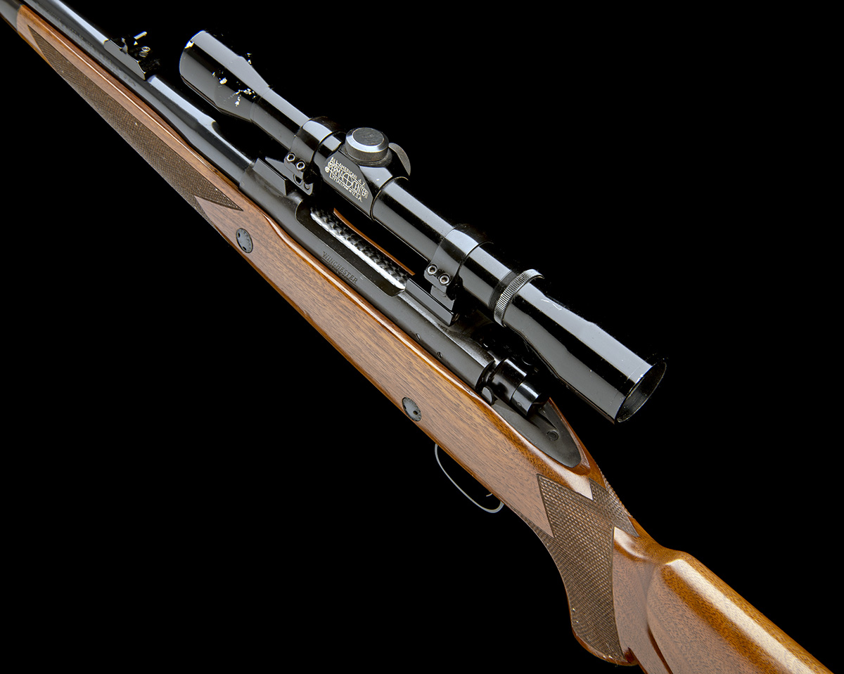 22in. nitro barrel with open sights and ramp-mounted bead fore-sight, the receiver mounted with a Lyman 'All-American 4x Perma Center' telescopic sight in quickly-detachable mounts, floral engraved recoil blocks, hinged floorplate, pistolgrip stock with cheekpiece and monte carlo comb, Winchester pistolgrip-cap, sling swivels, 13 3/8in. pull including 7/8in. rubber recoil pad, weight 8lb. 10oz. (unscoped) and 9lb. 10oz. (with scope)