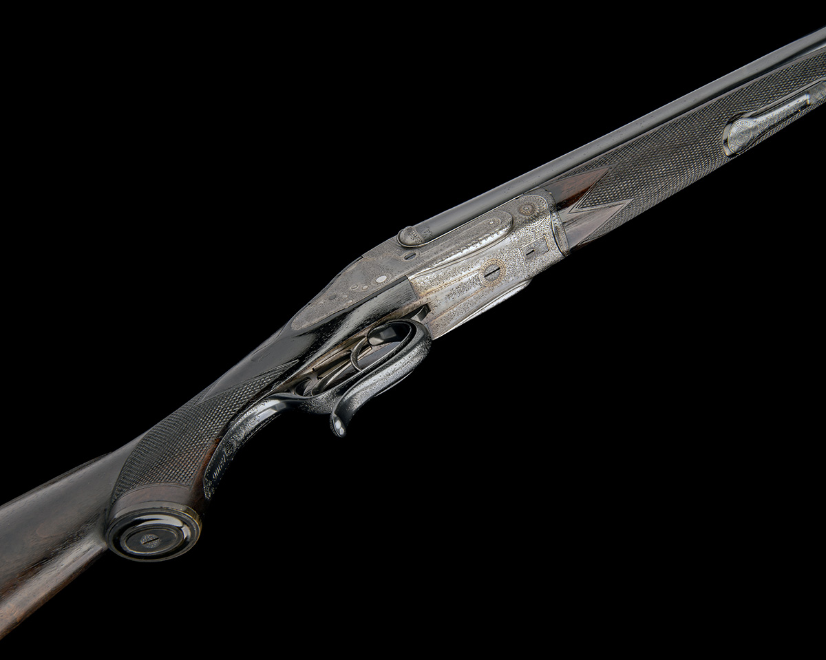 26in. black powder only barrels, raised file cut rib engraved in gothic script 'JOHN RIGBY & CO. DUBLIN & LONDON', open sights with folding leaf sight with white metal sight lines and marked for 150 and 250 yards, ramped bead fore-sight, treble-grip action incorporating J. Rigby and T. Bissell patent rising third bite, patent no. 1141 of 1879, use number 392, the action face numbered 2061, underlever cocking, carved leaf fences, removable striker discs (left striker missing), automatic safety with gold-inlaid 'SAFE' detail, dipped-edge lockplates, fine acanthus scroll engraving, retaining some colour-hardening and likely renewed finish, light damage to bar forward of right lockplate, 14 5/8in. pistolgrip stock, the pistolgrip of two piece construction and with horn pistolgrip-cap, engraved sling button and chequered steel buttplate, fore-end with Rigby's patent lever release, weight 8lb. 15oz.