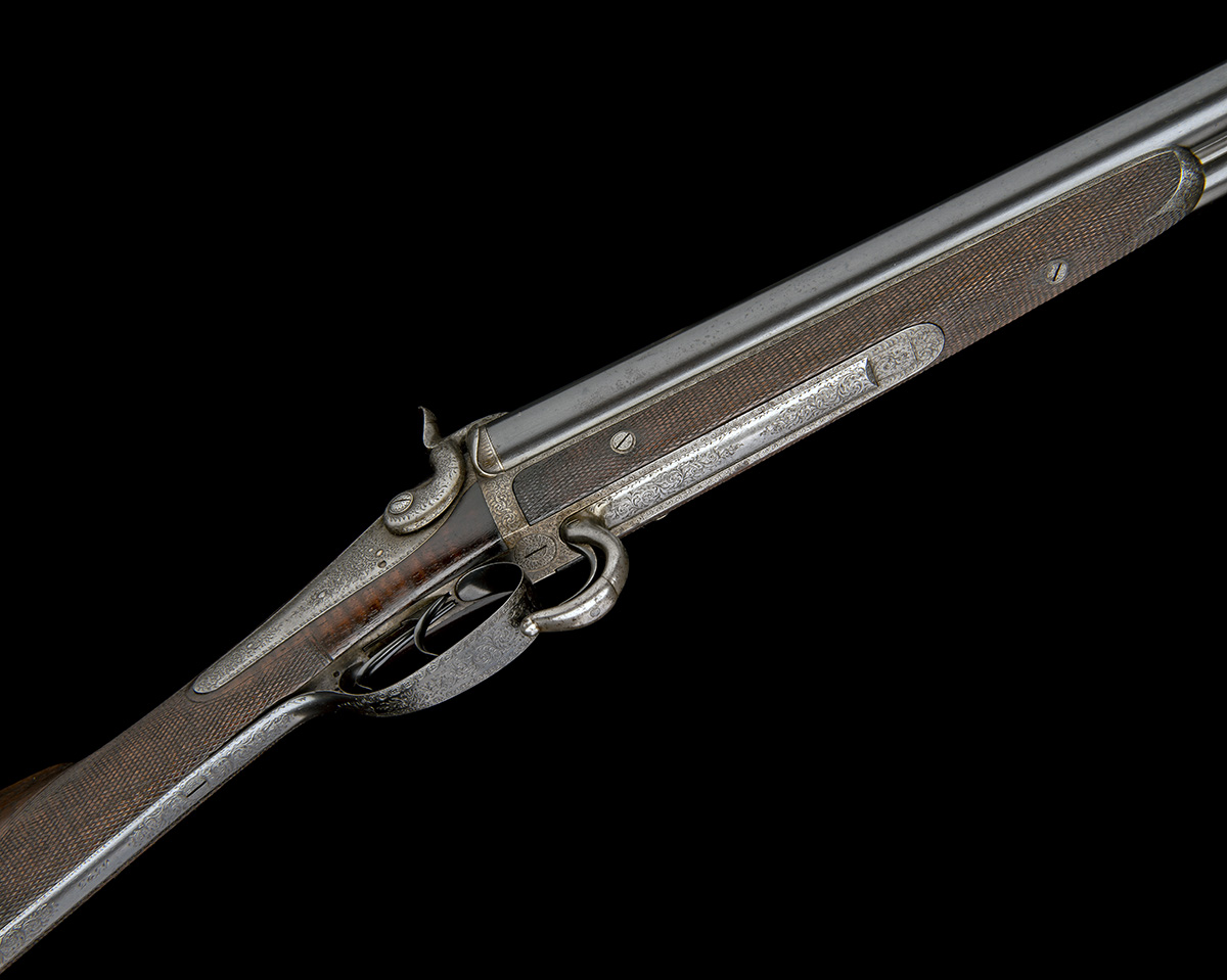 30in. blued (likely damascus) barrels, the rib engraved 'J. PURDEY 314 1/2 OXFORD STREET. LONDON.' (faint), Bastin slide-action system, the underlever of push-forward form, the lever hook with built up end section, slender carved serpentine pinfire fences, non-rebounding back-action locks, the large dolphin hammers with pinfire cartridge extraction apertures, one hammer screw a replacement, border and acanthus scroll engraving, the lockplates signed 'PURDEY', 15in. stock (possible replacement, chequering refreshed) including 1/2in. horn buttplate, weight 6lb. 13oz.