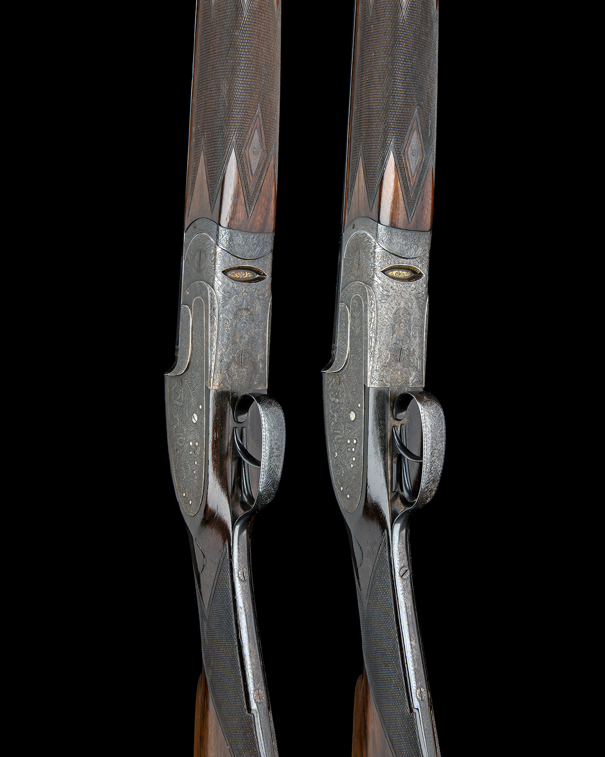 hold-open toplevers gold-inlaid '1' and '2', carved and pieced at the thumbpieces with sea serpents, manual safeties with gold-inlaid 'S' details, short side bolsters, gold-inlaid cocking-indicators, articulated front triggers, profusely engraved with fine acanthus scrollwork with floral and ribbon designs, the undersides with recessed elliptical cartouches gold-inlaid around the inner edge 'VICTOR SARASQUETA EIBAR', retaining much original colour-hardening and finish, 14 1/2in. figured stocks including 1/2in. wooden buttplates, weight 7lb. 5oz.
