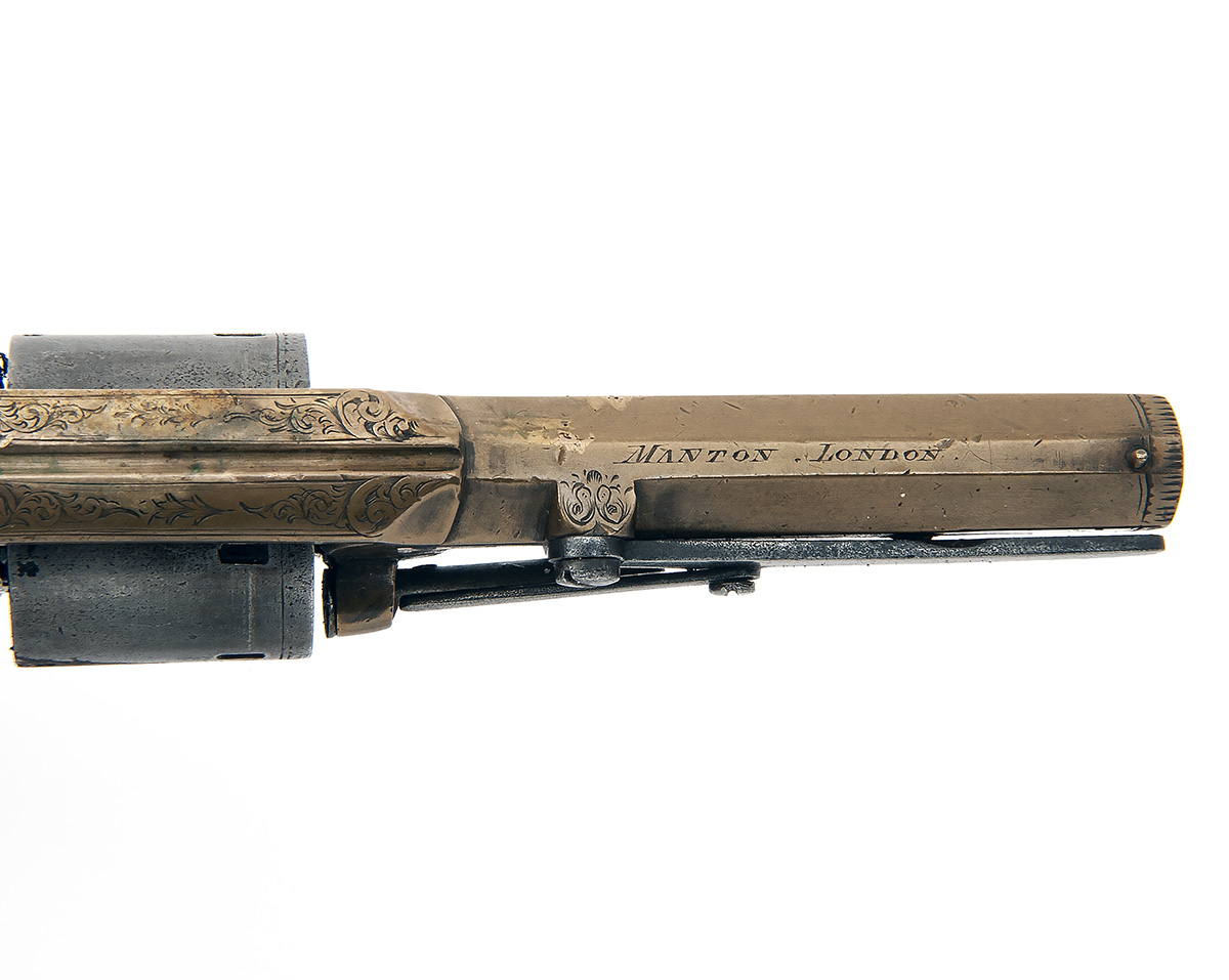 circa 1870, very similar in style to a Tranter Model 2 but with octagonal brass 3 1/2in. barrel signed on the top-flat 'MANTON, LONDON', bead fore-sight, plain iron cylinder with front locking notches and traces of engraving to the leading edge, border and scroll engraved brass frame with sprung cylinder release and compound linkage articulated ejector mounted on the right hand side of barrel, spurred hammer, sheath trigger, chequered walnut grips and exaggerated web to the back-strap