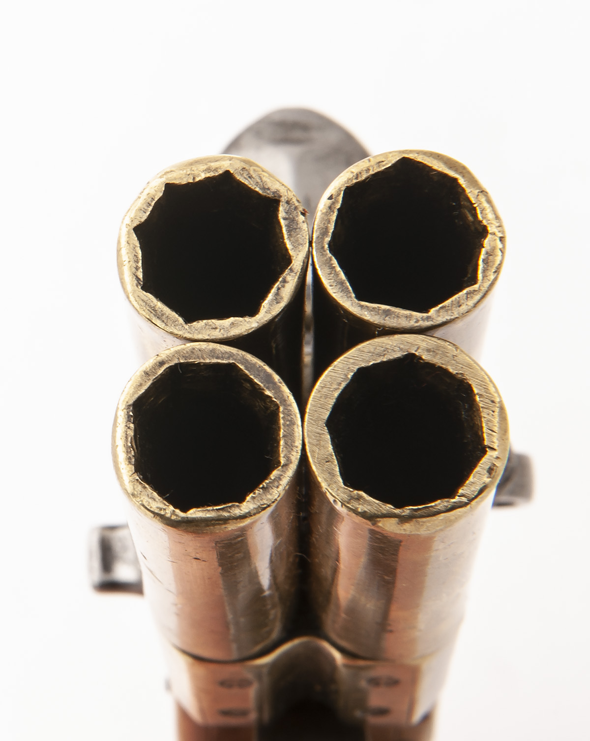 A RARE 54-BORE FLINTLOCK ALL-BRASS FOUR-BARRELLED TAP-ACTION OVERCOAT PISTOL, no visible serial number,