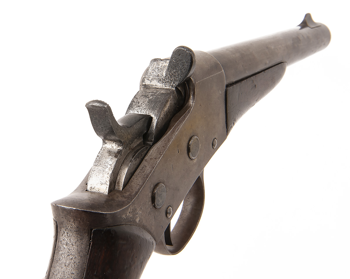 circa 1875, with tapering 7in. barrel, pinched blade fore-sight, sighting notch carved into top-edge of the rolling breech, central hammer, the left side of frame marked 'REMINGTONS ILION N.Y. U.S.A.' together with patents to 1866 and the letters 'P' and 'S', the right side plain, guarded trigger, smooth walnut flared grip and splinter fore-end, traces of finish