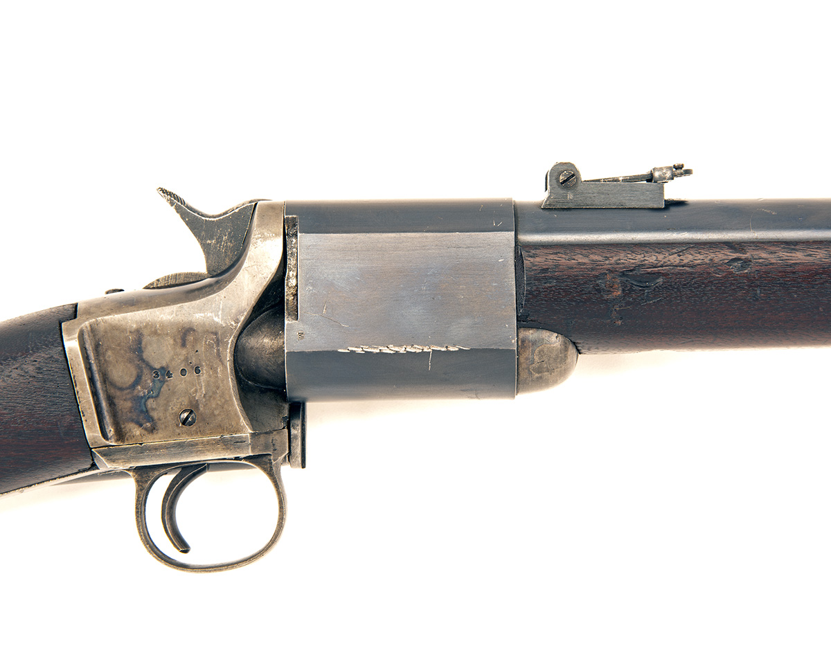 manufactured 1864-65, with 22in. round barrel, pinched blade fore-sight, elevating ladder rear-sight, slab-sided rounded-top and bottom, the breech side marked 'KENTUCKY', slab-sided central hammer receiver signed 'MERIDEN MAN.FG. CO., MERIDEN, CONN.', the top-tang marked 'TRIPLETT & SCOTT PATENT DEC. 6 1864' and mounted with the barrel-release button, sprung trapdoor for the concealed tubular magazine in the butt, walnut butt-stock with iron heel-plate (expertly repaired crack at head around magazine tube), sling swivels mounted at heel and toe and walnut splinter fore-end with singular iron barrel-band, much original colour and finish remaining