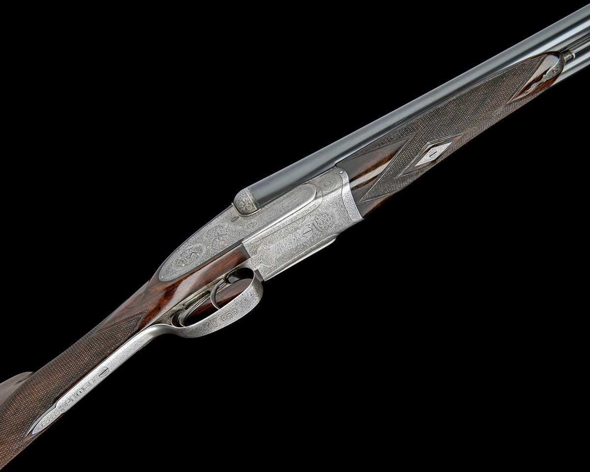 extra 30in. nitro barrels (left wall at 16), the rib engraved 'BARRELS BY WILLIAM FORD LTD. BIRMINGHAM.' and '2', 2 1/2in. chambers, bored approx. 1/4 and 1/2 choke, toplever engraved '2' (later), automatic safety with gold-inlaid 'SAFE' detail, gold-inlaid cocking-indicators, border and foliate scroll engraving, brushed finish, 14 1/2in. figured stock including 3/4in. rubber recoil pad, weight 6lb. 11oz. (6lb. 15oz. with extra barrels), in a case with provision for both sets of barrels