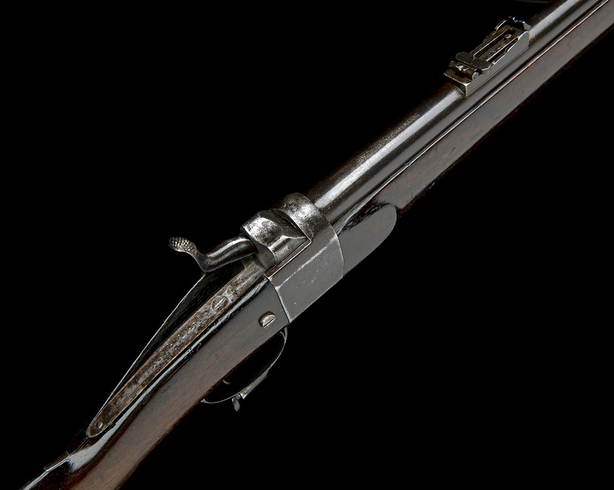 dated for 1871, with 33 1/4in. round barrel marked 'HENRY'S PATENT RIFLING', block and blade fore-sight, elevating ladder rear-sight, slab-sided action marked 'HENRY'S PATENT' on the left and 'WRA & A Co.' on the right together with the date, non-rebounding plain back-action left hand lock signed 'ALEXR. HENRY', walnut straight-hand stock stamped with New South Wales contract markings, smooth iron buttplate, push button release to tip of under-lever opener, walnut three-quarter military style fore-end with two iron barrel-bands, the front example with bayonet lug and an iron nose-cap, provision for under-barrel clearing rod (absent)