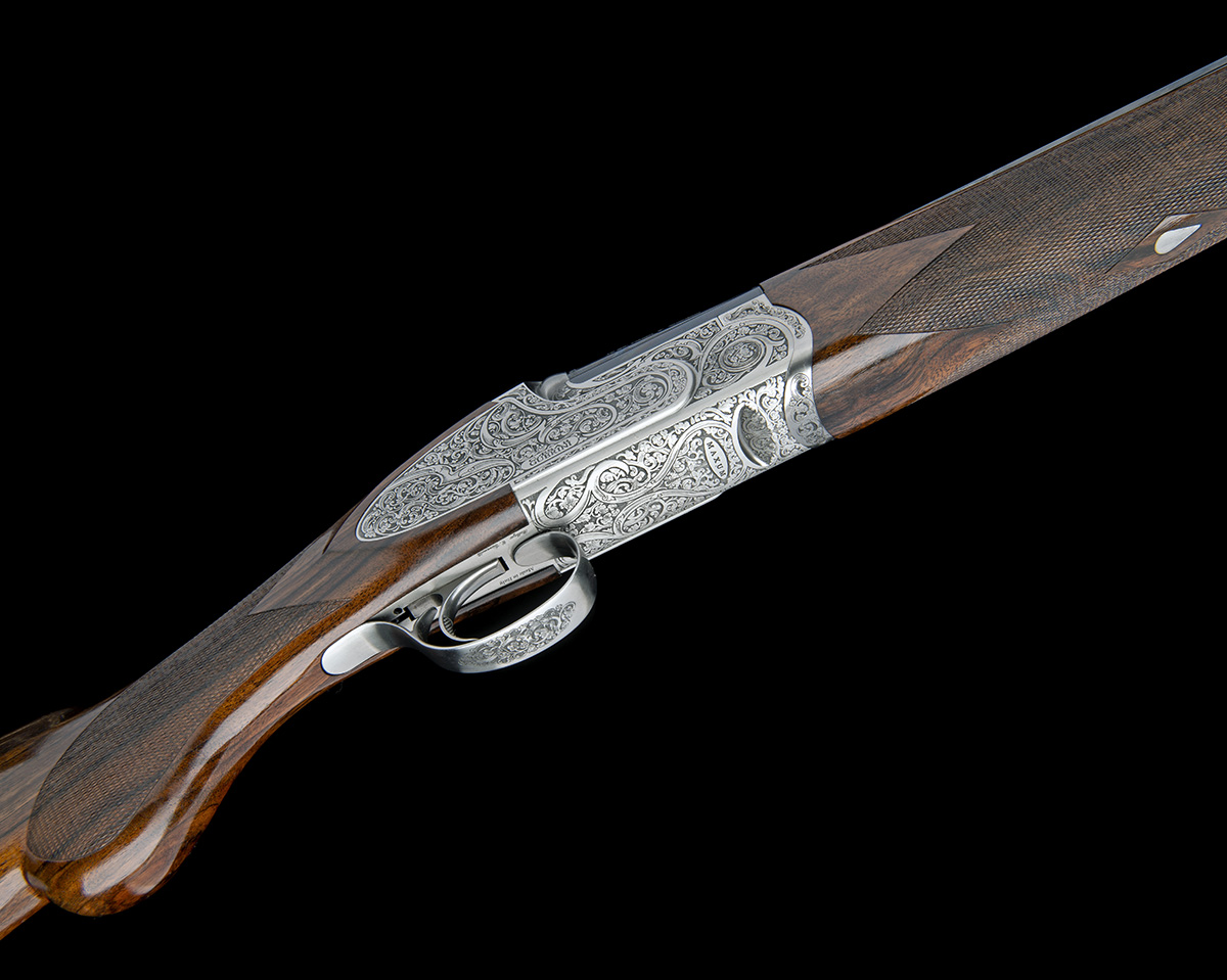 30in. nitro barrels with 8mm ventilated matt top-rib, 3in. chambers, multichokes (no spares), hold-open toplever, automatic safety with integral barrel selector switch, the action, furniture and decorative sideplates with bold ribbon and acanthus designs on a matt background, triggerplate signed 'Bottega C. Giovanelli', silver finish, 14 3/4in. figured pistolgrip stock including wooden buttplate, sculpted fore-end, weight 7lb. 6oz.