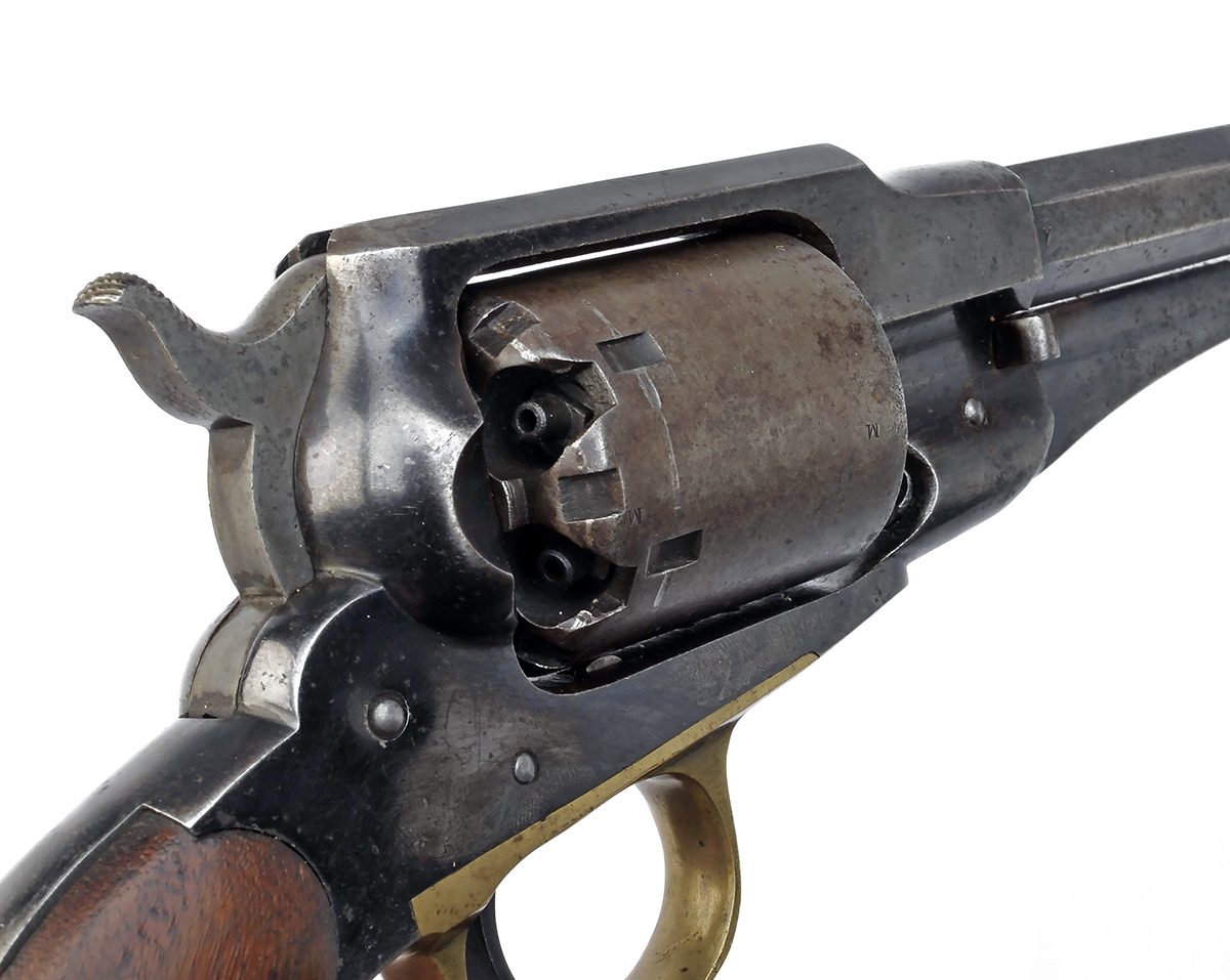 circa 1864, with blued octagonal 8in. barrel signed 'PATENTED SEPT 14 1858, E. REMINGTON & SONS, ILION NEWYORK U.S.A., NEW MODEL', conical fore-sight, sighting groove to the top-strap, blued frame, plain blued cylinder, single action mechanism, brass trigger-guard and possible replacement walnut grips, the whole retaining a strong amount of original finish (cylinder faded)