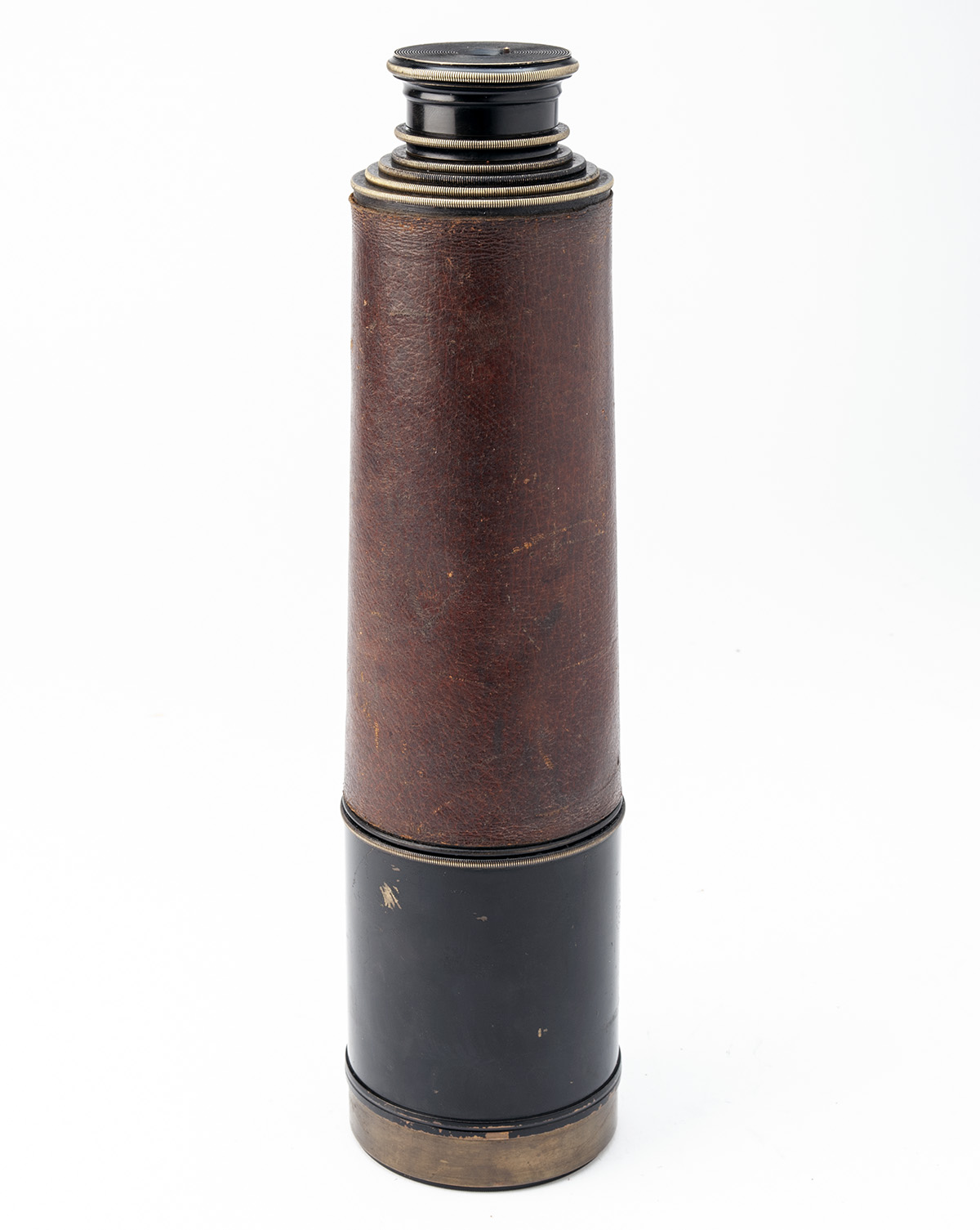 A BRASS AND LEATHER FOUR-DRAW STALKING TELESCOPE,