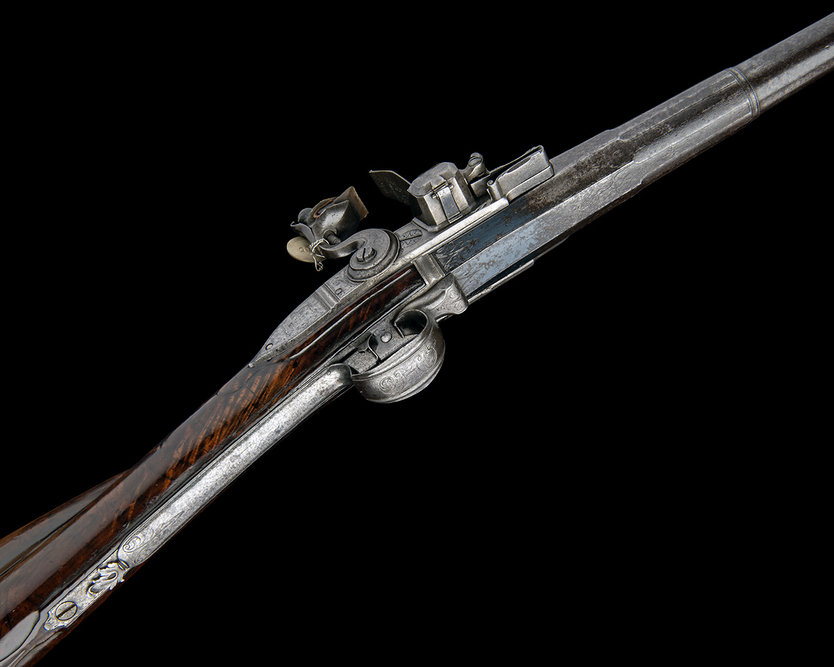 A RARE FLINTLOCK BREECH-LOADING SELF-PRIMING SINGLE-BARREL SPORTING-GUN, no visible serial number,
