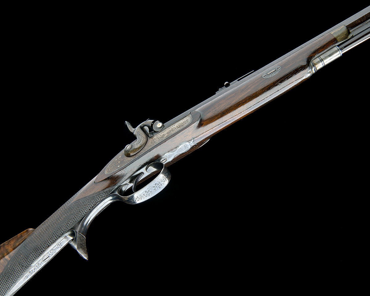 possibly made for Minie circa 1850, with browned damascus octagonal 30in. barrel, shallow blade fore-sight, elevating ladder rear-sight, engraved colour hardened patent squared breech, fully engraved top-tang, carved and moulded snail with platinum vented plug, border and scroll engraved colour hardened bar-action lock signed 'R.T. PRITCHETT', scroll engraved hammer, figured walnut half-stock chequered at the wrist, re-blued iron furniture including raised and chequered pistol-grip spur to lower tang, horn fore-end tip and under-barrel heavy duty ebony ramrod