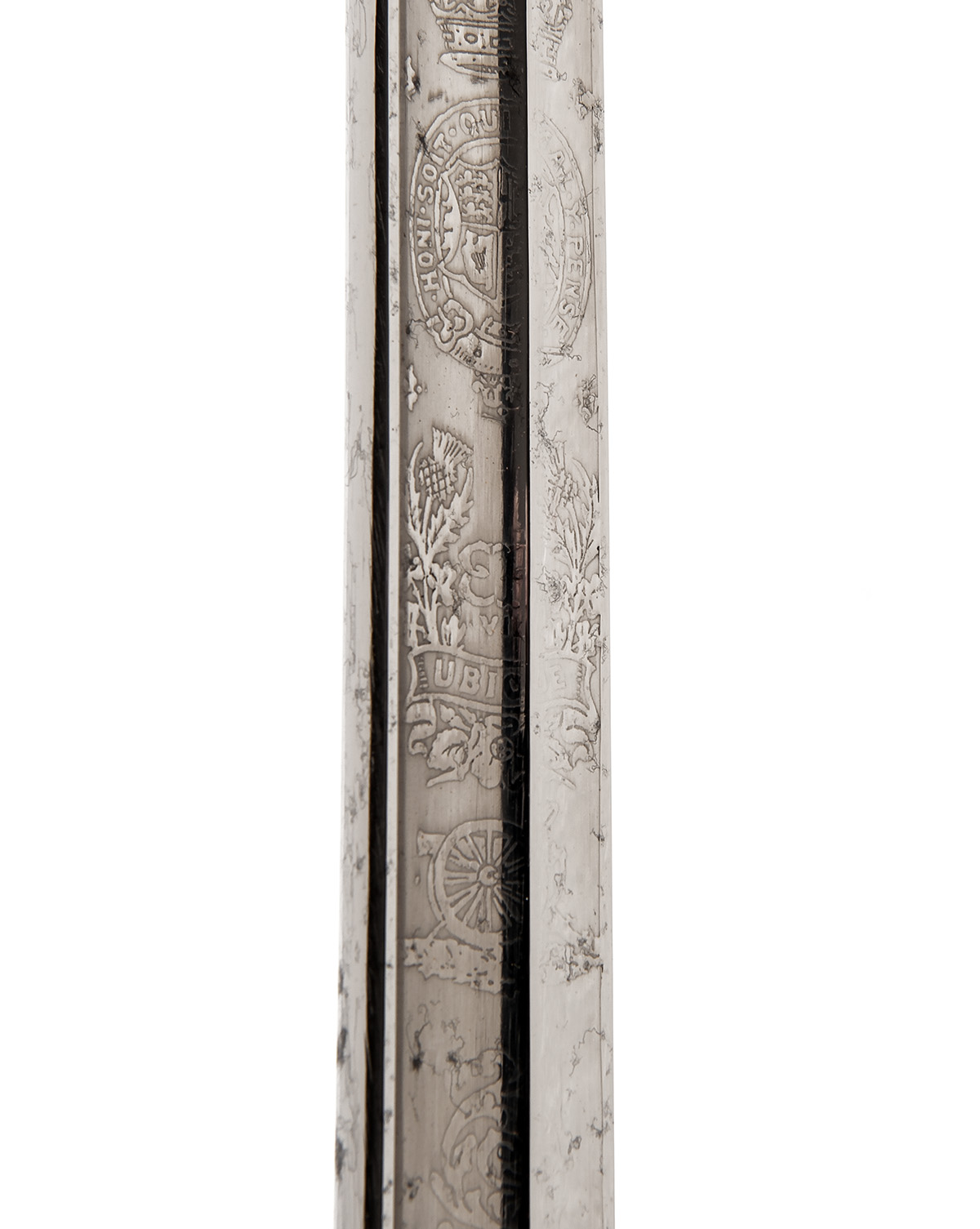 circa World War One, with slightly curved 34in. polished and cleaned blade etched with scrolls, 'UBIQUE', a cannon and a 'GRV' device within an arabesque panel on the right hand side, the left similar but with winged lightning bolts and 'ARTILLERY', 'MADE IN ENGLAND' and serial number to back edge, inlet proof mark at forte, plated half-basket hilt with three narrow bars, wire-bound sharkskin grip, chequered back-strap with stepped and domed pommel and complete with its brown pigskin leather scabbard and leather sword knot.