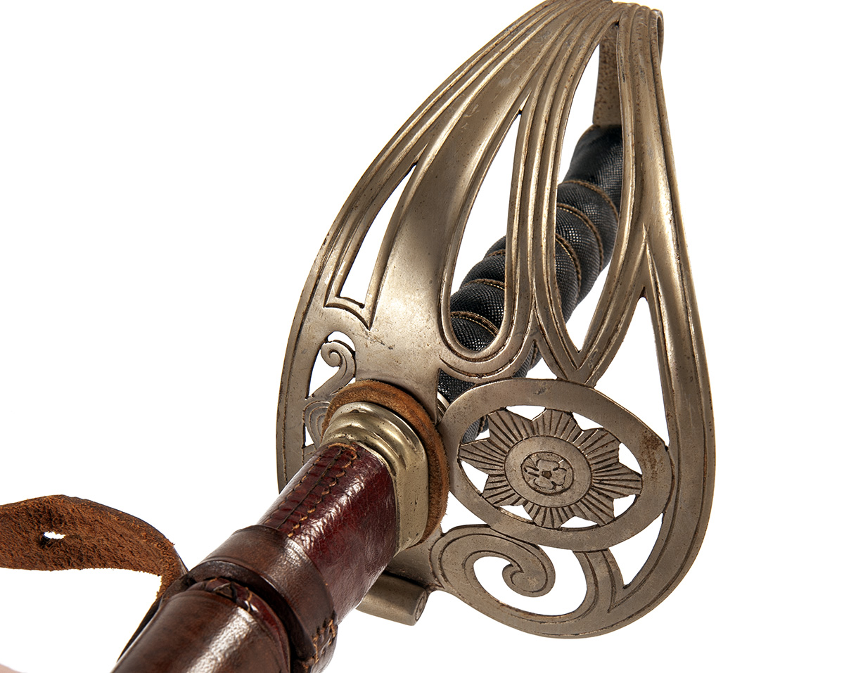 circa World War One, with straight 32in. polished blade etched with scrolls and a 'GRV' device within an arabesque panel on the right hand side, the left similar but with Kings crown and the star-shaped badge of the Irish Guards, 'MADE IN ENGLAND' and serial number to back edge, inlet proof mark at forte, plated half-basket hilt with Irish Guards badge and three reeded bars, wire-bound sharkskin grip, chequered back-strap with domed pommel and complete with its brown pigskin leather scabbard