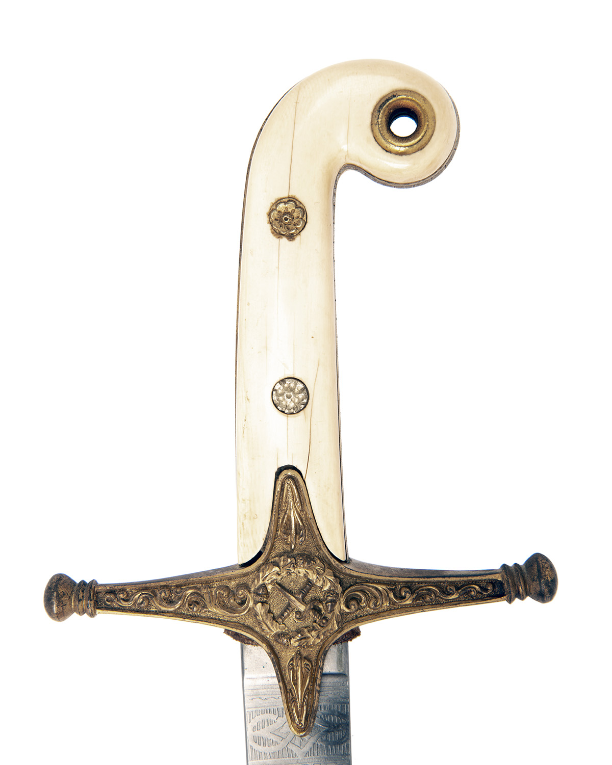 circa 1880, with curving 30 1/2in. hatchet-tipped blade etched with foliage, the general's device of crossed baton and sword and the monogram of Queen Victoria all within an arabesque panel, the left side also bearing the retailers mark 'CATERS 56 PALL MALL LONDON', chisel carved straight gilt cross-guard with general's device to centre, carved langets, ivory pistol-grip hilt fixed by two florally carved rivets and with lined knot-hole to pommel, complete with its lozenge profile polished brass scabbard with twin loose suspension rings