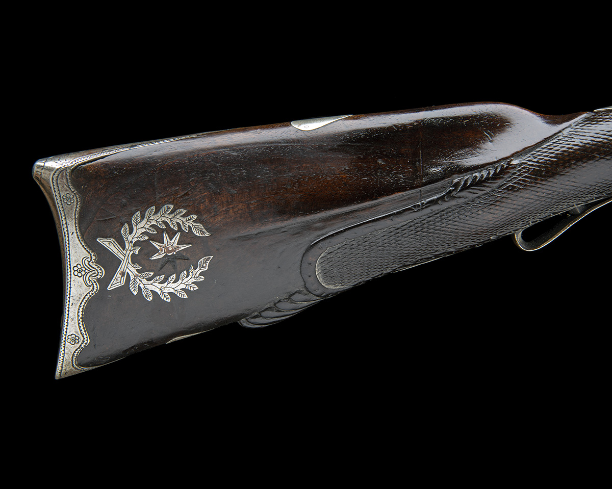 circa 1800 and mounted in the French style but with 53in. Persian barrel carved with a shallow raised sighting rib inlaid with white metal stars and arrows terminating in an engraved arabesque panel at the muzzle, applied white metal trench fore-sight, the breech with inlaid adulation or false signature with further engraved longitudinal borders, stamped oval maker's mark, engraved brass top-tang, re-purposed military style lock signed 'TOWER' and with a 'G.R.' crown device below the pan, dark walnut full-stock in the french style with bordered chequered panel at the wrist, carved and moulded comb, substantial white metal heel-plate, both sides of butt inlaid with white-metal crossed laurel branches below an eight pointed star, white-metal pillar trigger-guard with raised tang, four substantial embossed and pierced white metal barrel-bands (out of position due to wood shrinkage), white metal rectangular swivels mounted to the side-plate and a bow-tie mount on the fore-end and turned iron ramrod