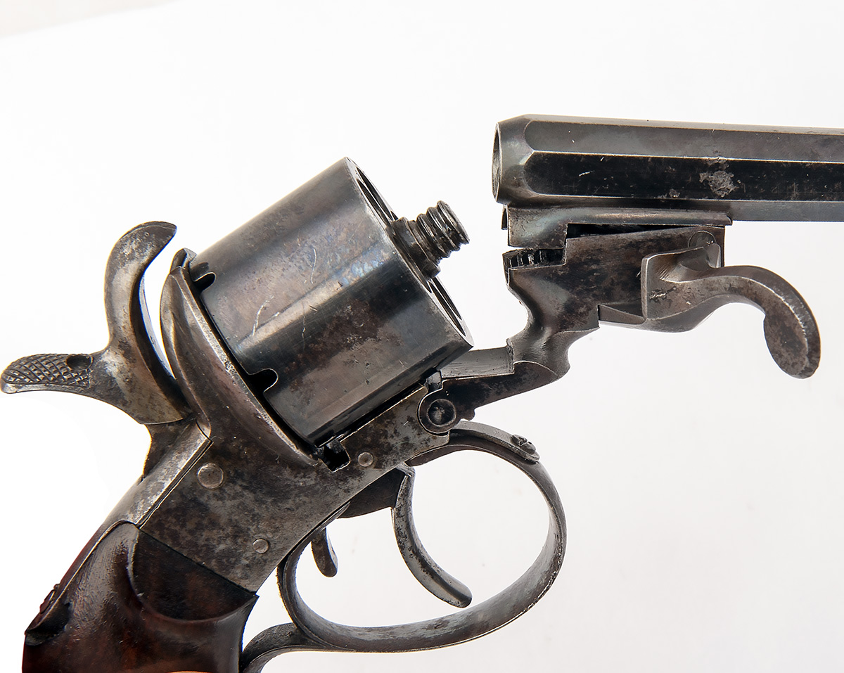 circa 1865, with blued octagonal 4in. barrel, bead fore-sight on a triangular base, forward facing swing under-lever allowing the barrel to tilt down releasing the cylinder arbor, the underside of action behind the lever signed 'JAVELLE M ST. ETIENNE' over 'BTE S.G.D.G.', plain cylinder drawing forwards and off to load, open iron frame with moulded standing breech, double action mechanism with spurred hammer and guarded trigger and smooth walnut semi saw-handled walnut grip with domed iron grip-cap, much original finish remaining