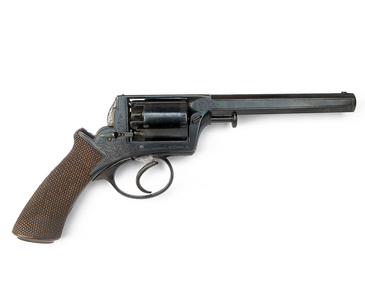 circa 1856, with re-blued octagonal 6in. barrel, engraved band at muzzle and borderline engraved panels to each flat, scroll engraving at throat, borderline engraved top-strap signed 'DEANE ADAM & DEANE NO. 30 KING WILLIAM ST.T. LONDON BRIDGE' (rubbed), plain five-shot cylinder with engraved band to leading edge, borderline and scroll engraved solid frame with sliding cylinder lock to the right hand side and inverted 'L' shaped safe-spring to the left, chequered walnut semi saw-handled grip, spurless hammer, refinished throughout and complete with its original oak storage case line and compartmented in green baize and together with a bag-shaped flask, bullet mould, turn-screw, loading and cleaning rods, caps etc., small parchment Deane Adams & Deane trade label inside lid