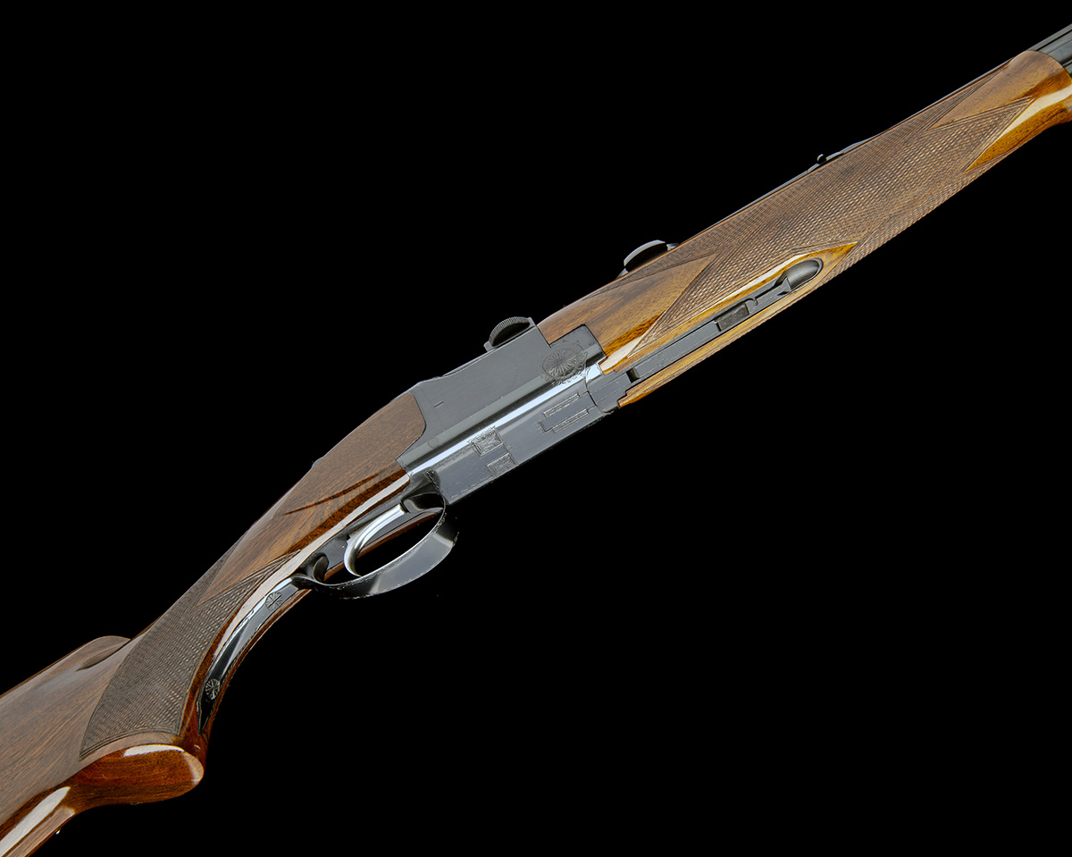 25 1/2in. nitro barrels with stepped solid file cut top-rib, folding open sights and ramped bead fore-sight, the breech end mounted with a Zeiss Diavari-ZM 1,25-4x24T* telescopic sight, serial no. 745618, in quickly-detachable mounts, hold-open toplever, automatic safety with integral barrel selector switch, border engraved blued action, 14 1/2in. figured pistolgrip stock including buttplate, weight 7lb. 7oz. (unscoped) and 8lb. 12oz. (with scope), in a Browning vinyl case (no provision for scope)