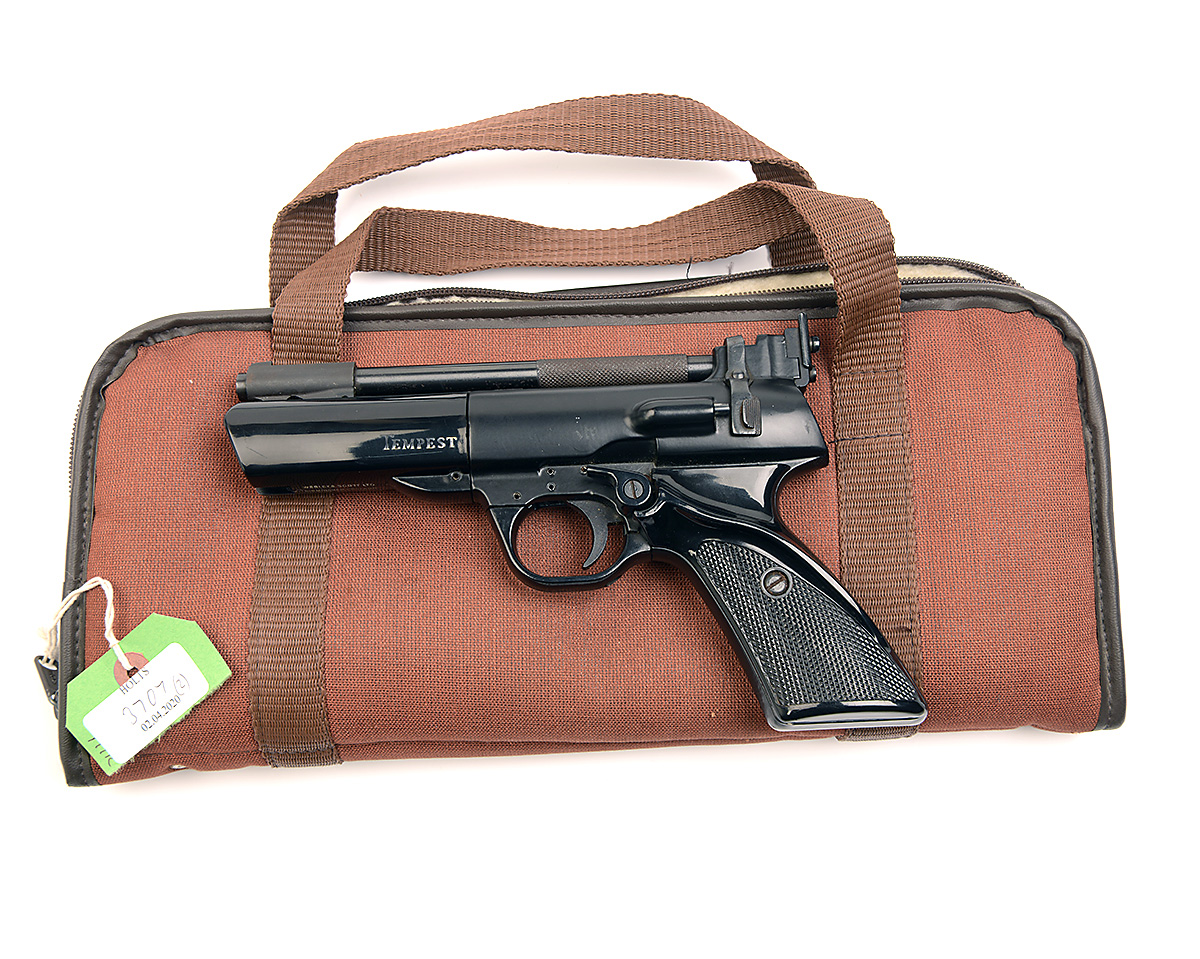 A .22 BARREL-COCKING AIR-PISTOL SIGNED WEBLEY & SCOTT, MODEL 'TEMPEST', no visible serial number, with blued 6 5/8in. barrel, adjustable rear-sight, stove enamelled alloy air-chamber with black plastic furniture and chequered grips, together with a pistol rug (2)
