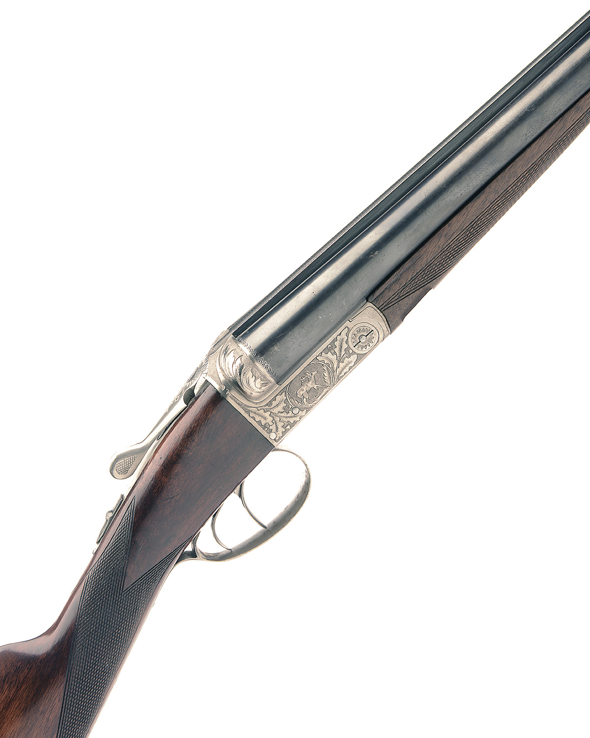 28in. nitro barrels, 2 3/4in. chambers, bored approx. 1/4 choke in both, automatic safety, engraved with oak leaves and deer, bright finish, 13 1/2in. stock;